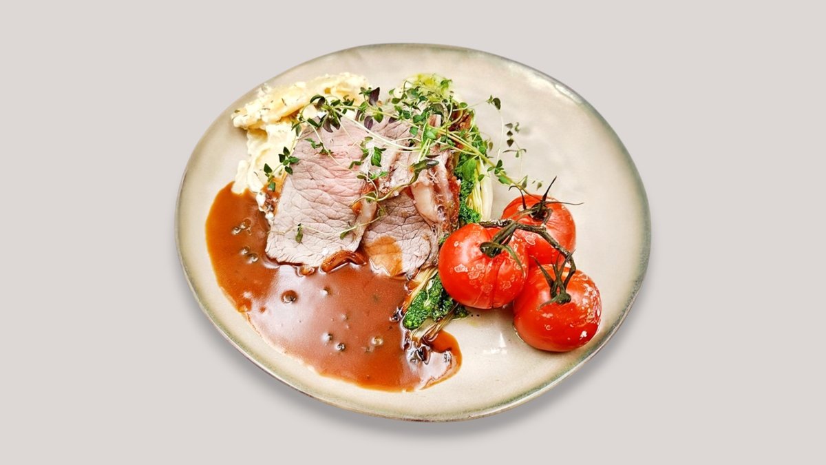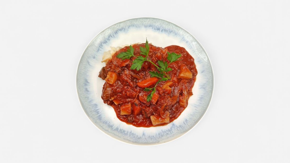 Boeuf stroganoff med skåret oksekød, ristet paprika, svampe og cremet mos