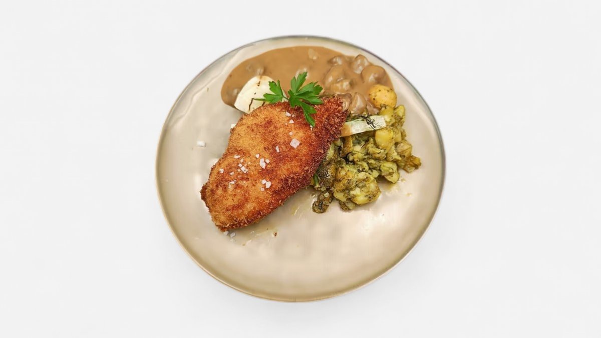 Svampefars med linser og grøntsager i butterdej serveres med stegte kartofler og fennikelsauce