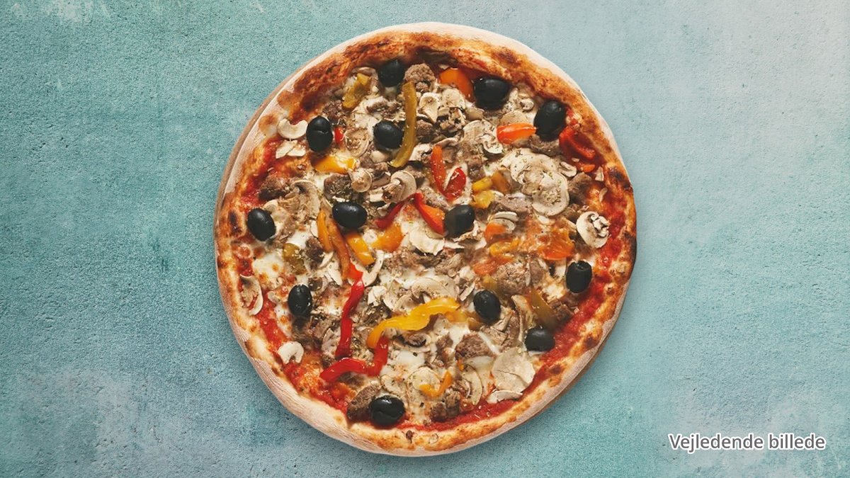 Tomatsauce, ost, marinerede kødstrimler, champignon, paprika og oliven
