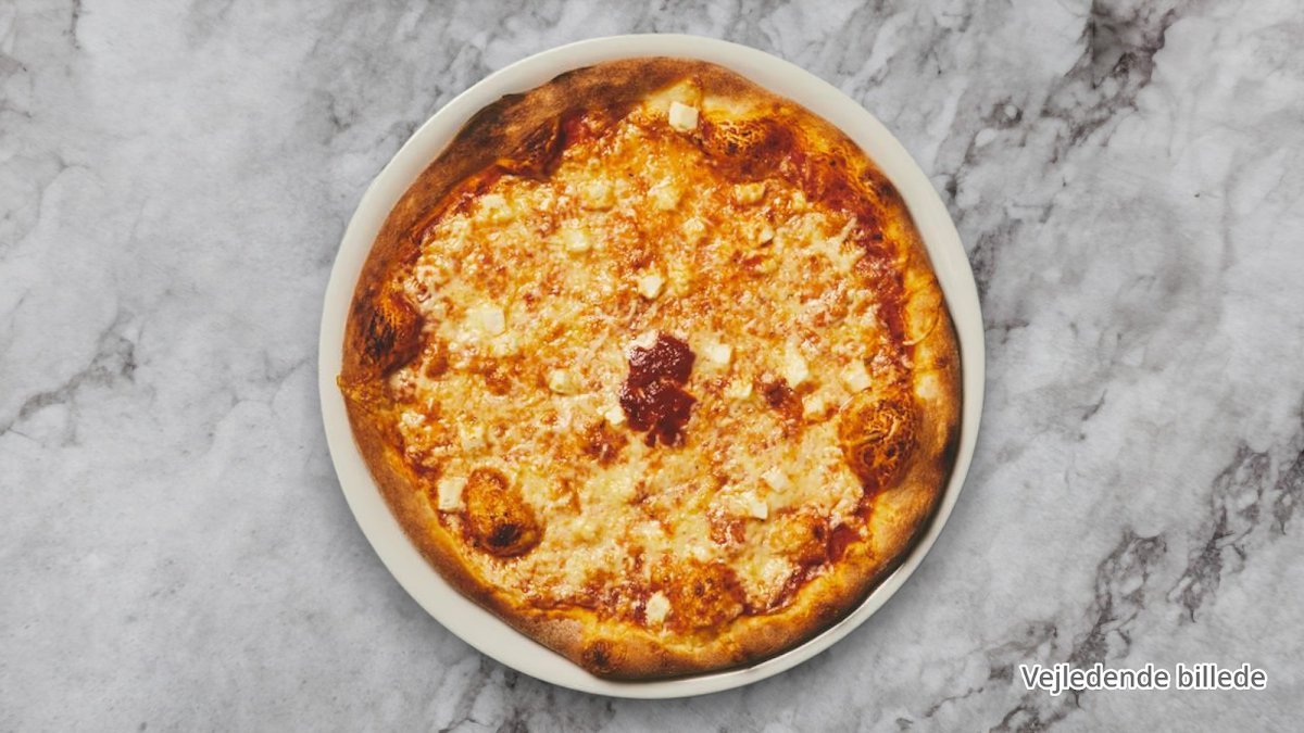 Tomatsauce, ost, fetaost, gorgonzolaost, parmesanost, mozzarellaost og pesto.
