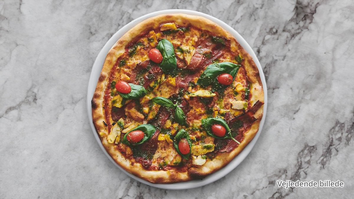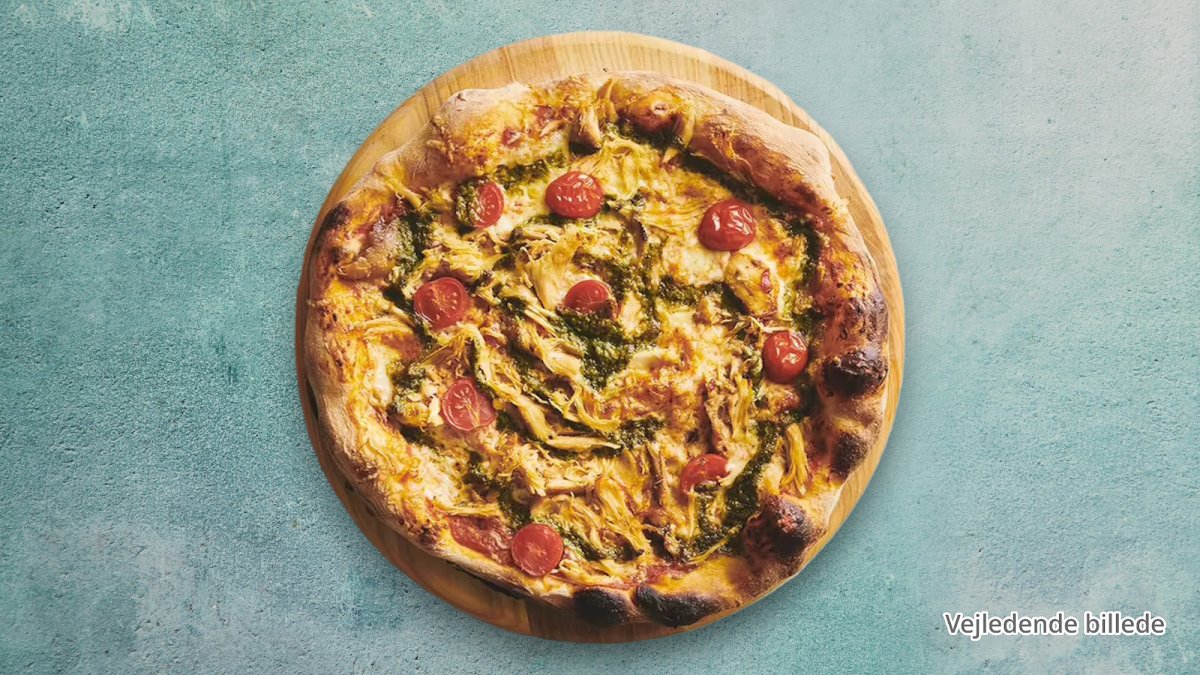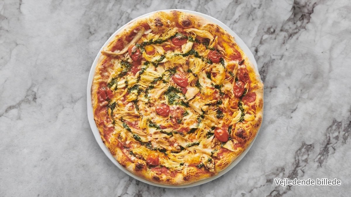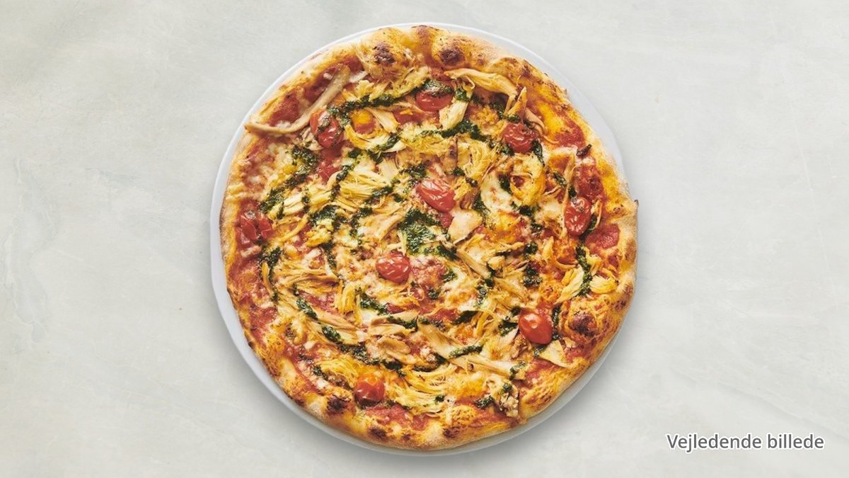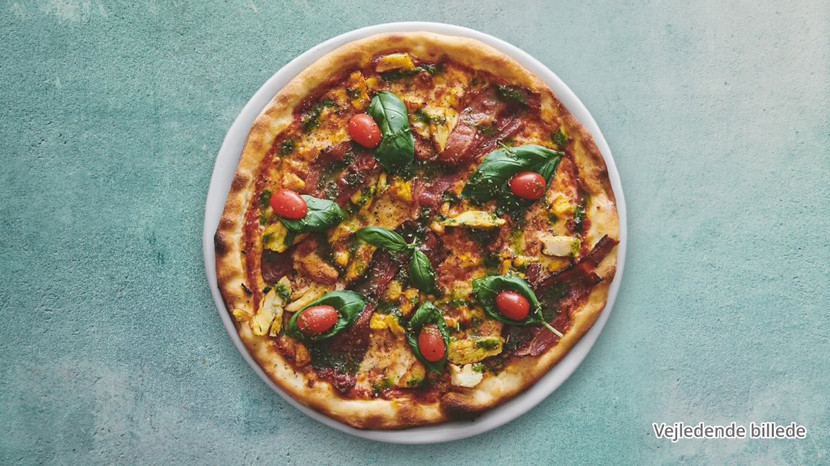 Tomatsauce, ost, oregano, krydret kylling, cherrytomater, creme fraiche og hjemmelavet basilikumspesto.