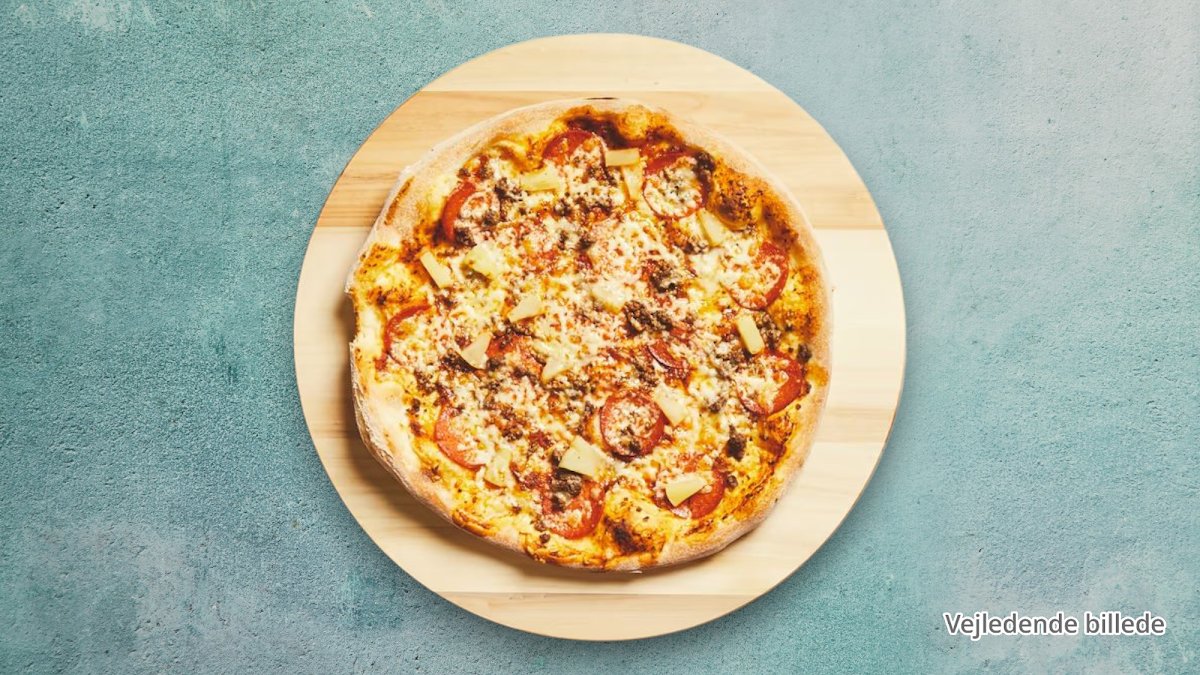 Tomatsauce, ost, oregano, kalkunskinke og ananas. Serveres med valgfri sodavand.
