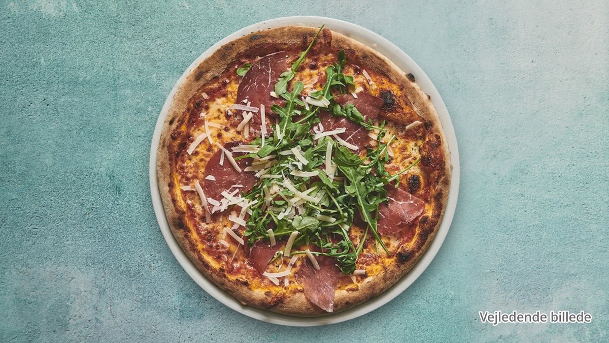 Tomatsauce, ost, oregano, bresaola, frisk mozzarella og hjemmelavet basilikumspesto.