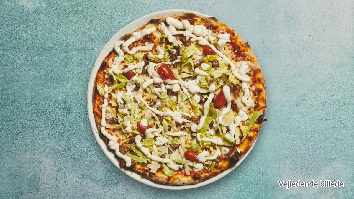 Tomatsauce, ost, oregano, icebergsalat, cherrytomater, cremefraiche dressing og valgfri protein. Serveres med valgfri sodavand.