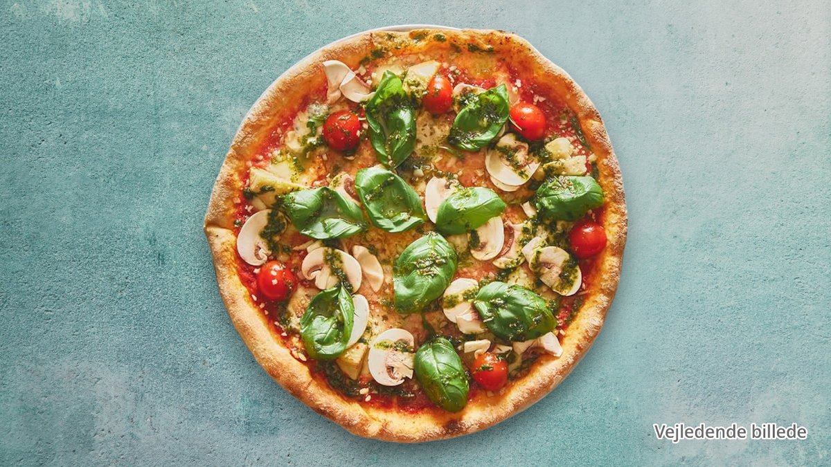 Tomatsauce, ost, oregano, friske cherry tomater og hjemmelavet pesto.