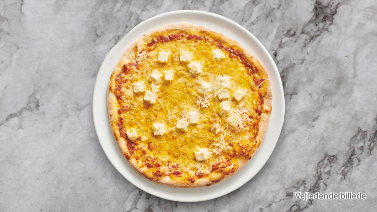 Børne pizza med tomatsauce, ost og valgfri protein.
