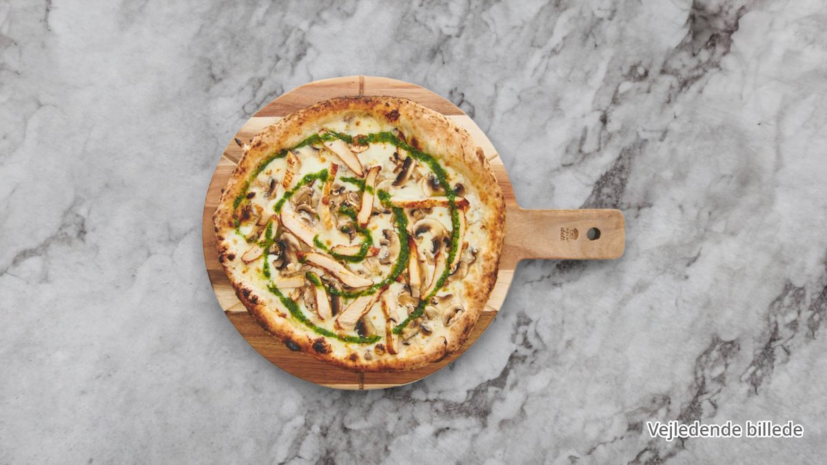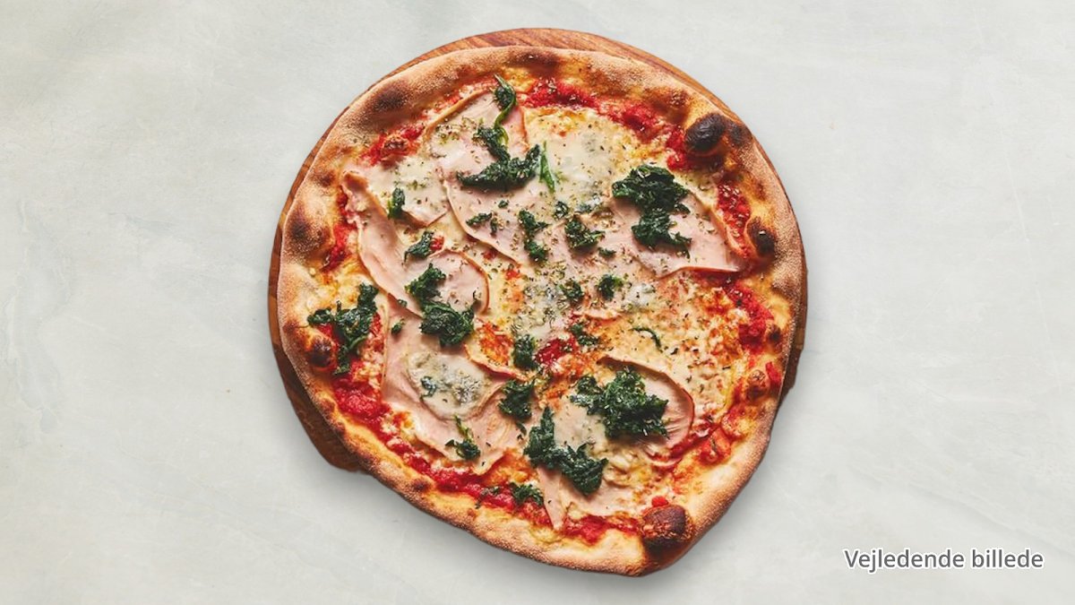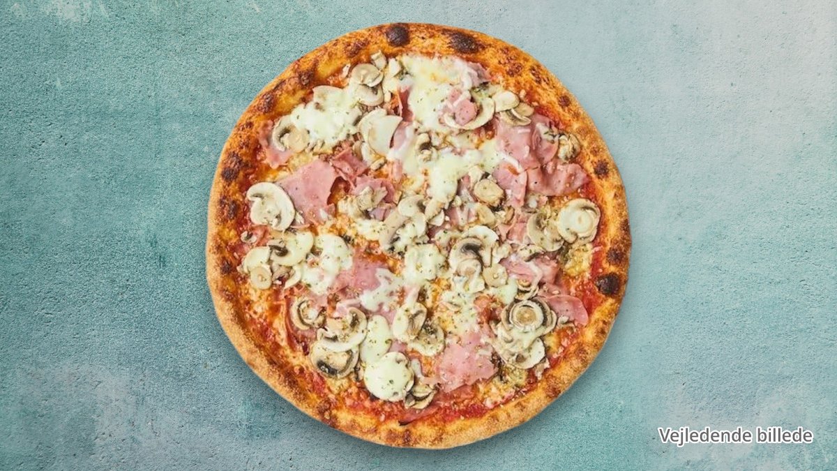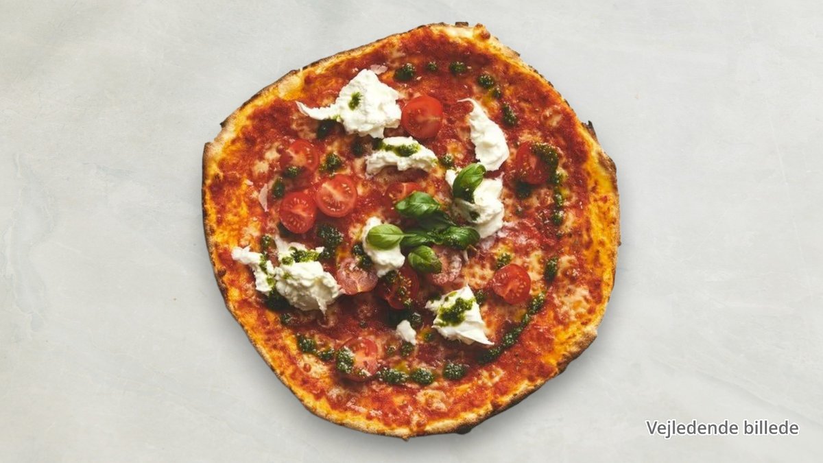 Tomat og mozzarella, skinke, champignon, løg, pesto, chili og hvidløg.