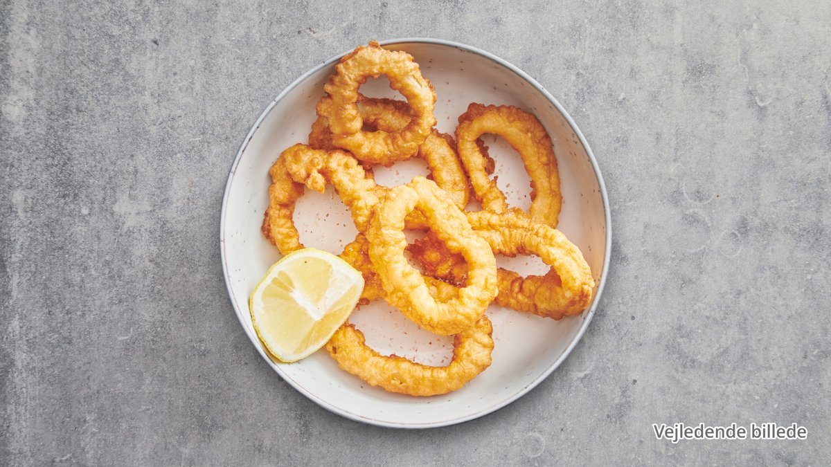 Dybstegte blæksprutteringe, serveres med sursød sauce eller sød chilisauce.