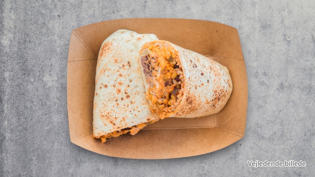 Hvedemelspandekager med fyld af valgfrit protein ris, bønner, oliven, salat, guacamole og salsa.