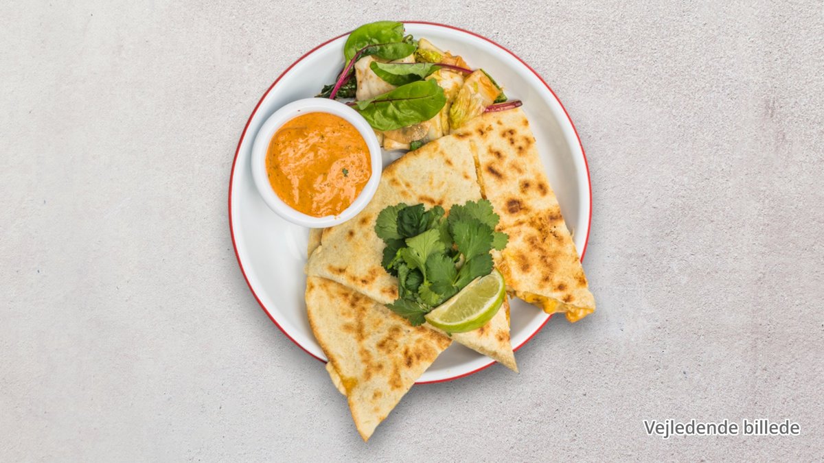 Hvedemelspandekager med fyld af valgfrit protein, cheddarost, ris, bønner, oliven, salat, guacamole og salsa.