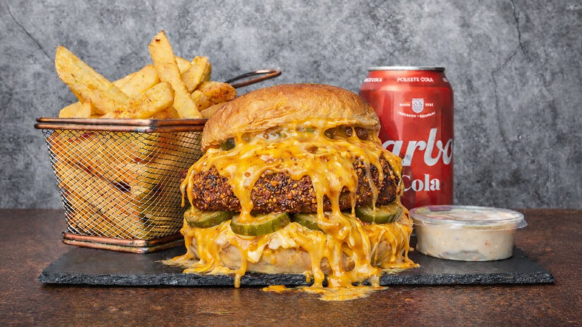 Sprødstegt krydret kylling, med dobbelt cheddar, pickles & slaw