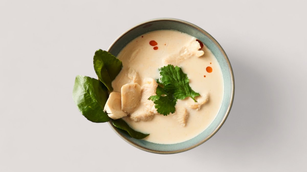 Krydet kokosmælk suppe. Med smag af limeblade, citrongræs, champignon, tomat og koriander