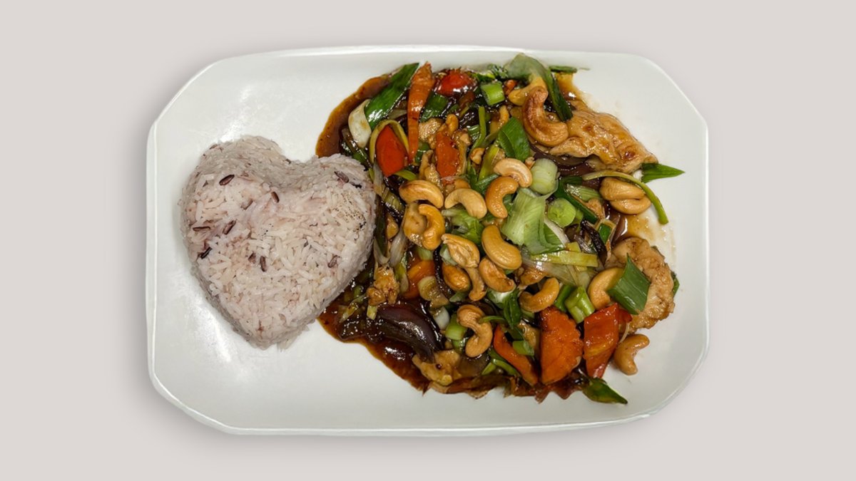 Stir-fried dish with cashew nuts, carrots, bell pepper, leeks and spring onion. Vælg selv protein til retten. Serveres med jasminris.