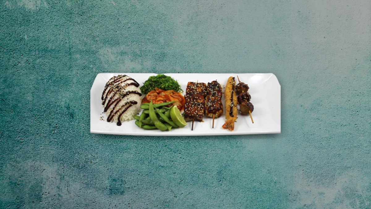 Kylling, kyllingeboller, laks og tempurarejer. Serveres med tangsalat, edamamebønner, kimchee og ris.