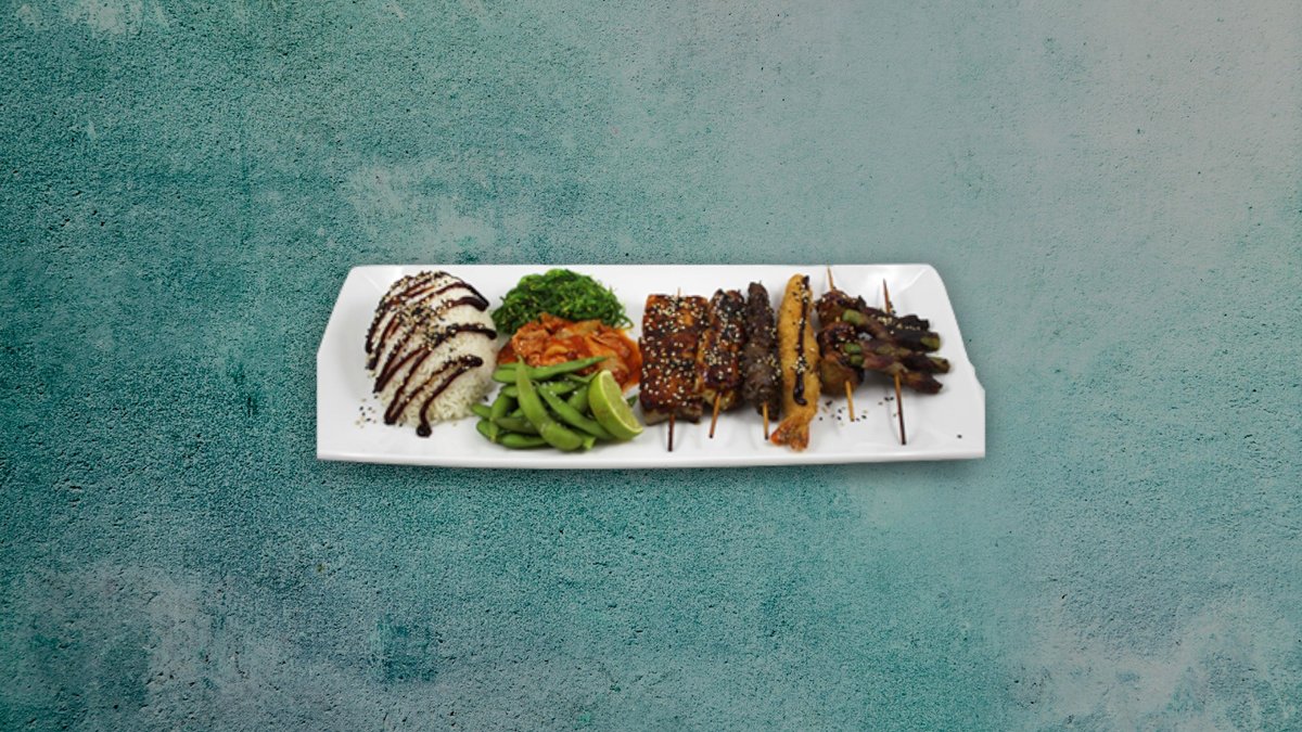 Kylling, kyllingeboller, laks, tempurarejer, oksesteak og asparges med okse. Serveres med tangsalat, edamamebønner, kimchee og ris.