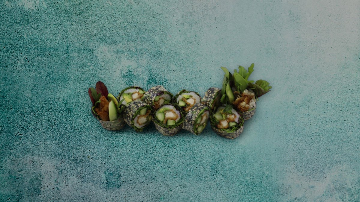 Agurk, avocado, salat og sesam. Toppes med teriyaki.
