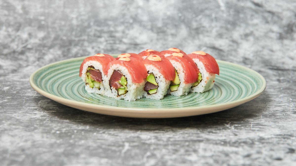 Tun, avocado, agurk og spicy mayo – toppet med tun.