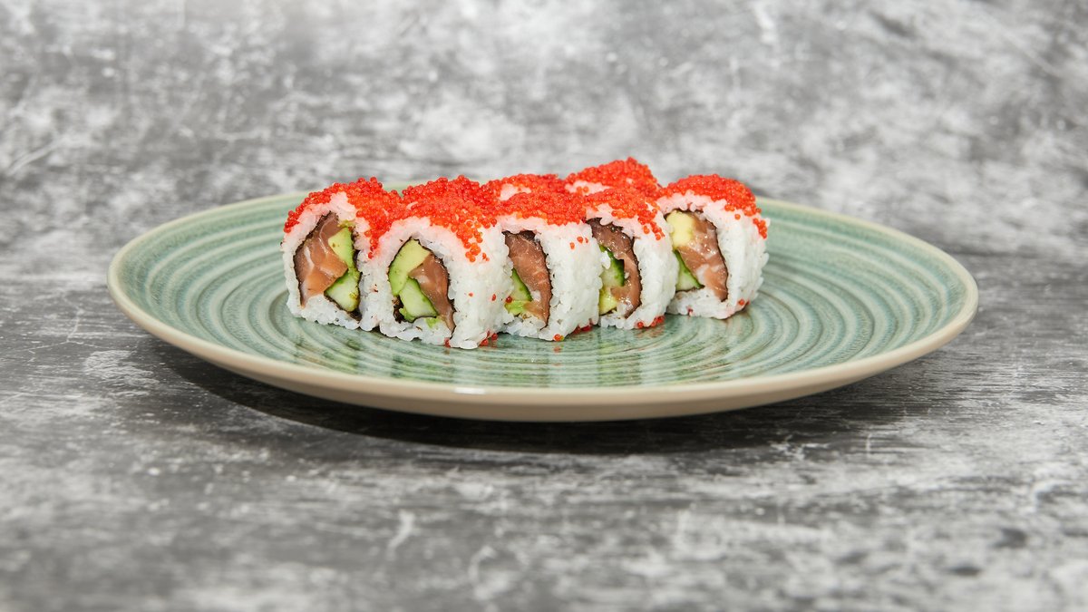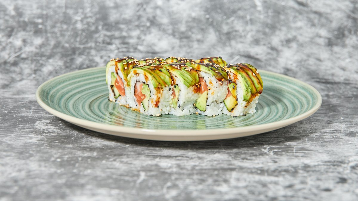 Laks, avocado, agurk og wasabi-mayo – toppet med avocado, teriyaki og sesam.
