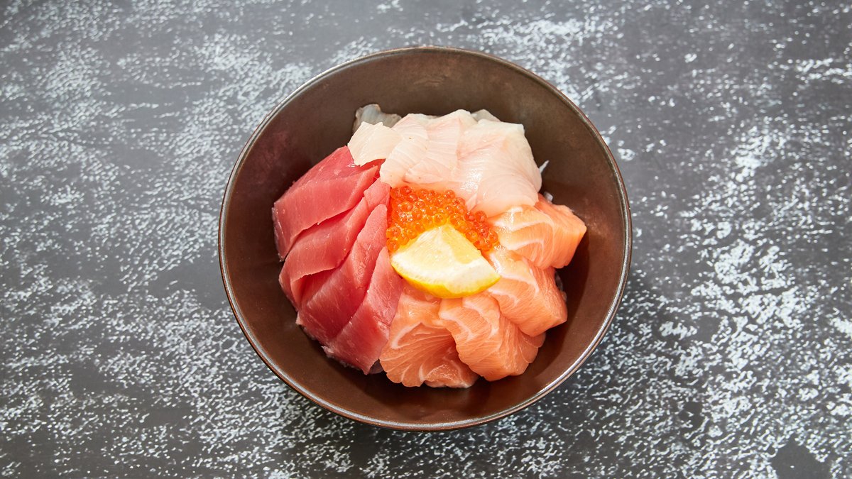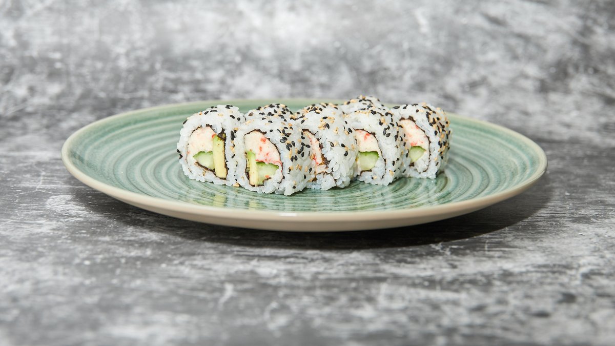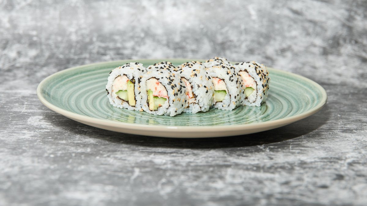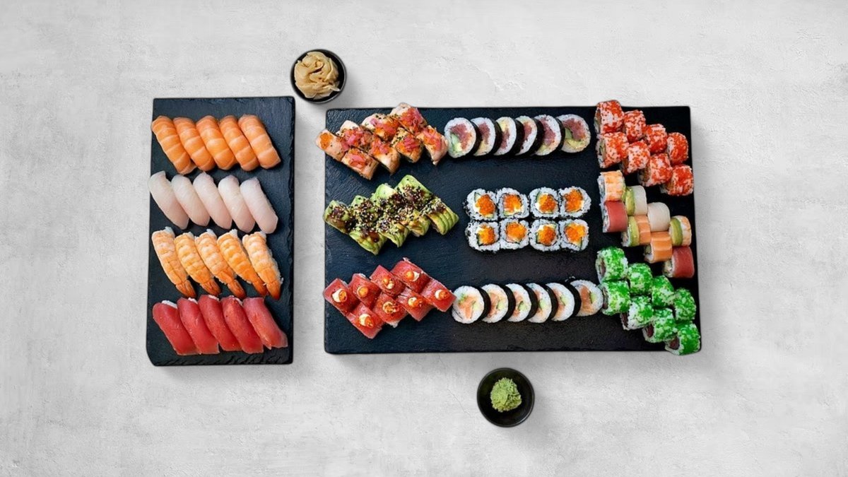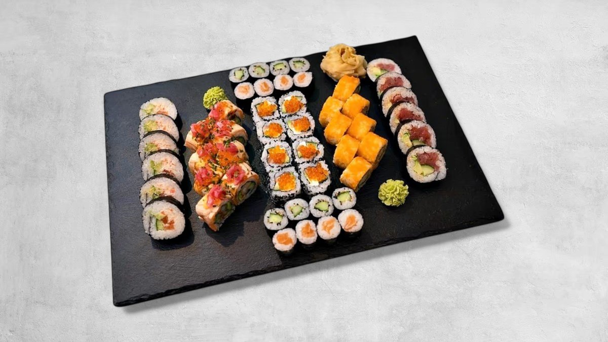Avocado, krabbesurimi og agurk – toppet med tun, laks, hvid fisk og rejer.