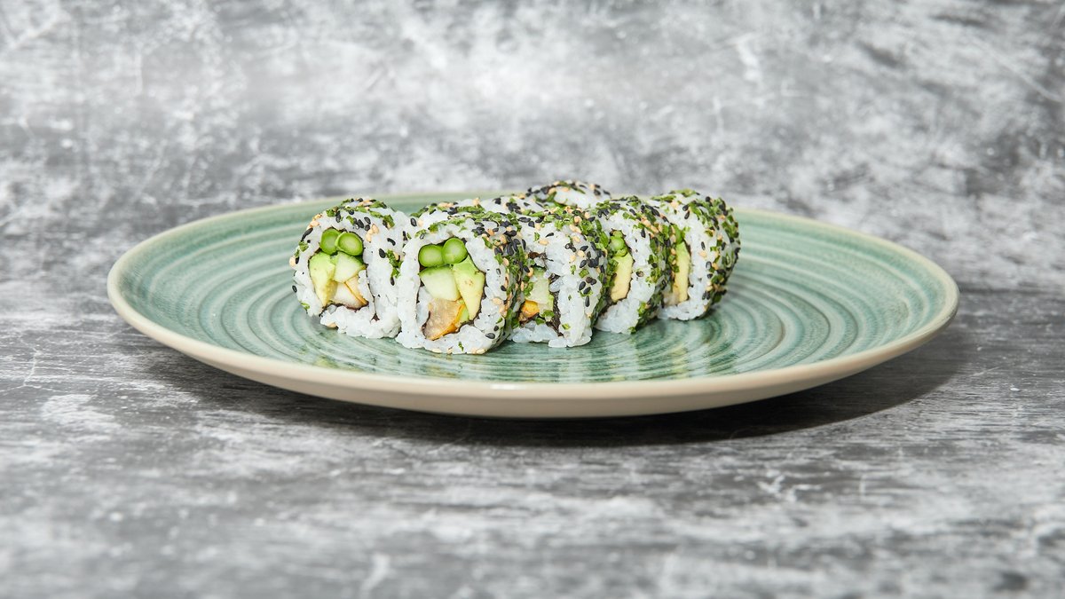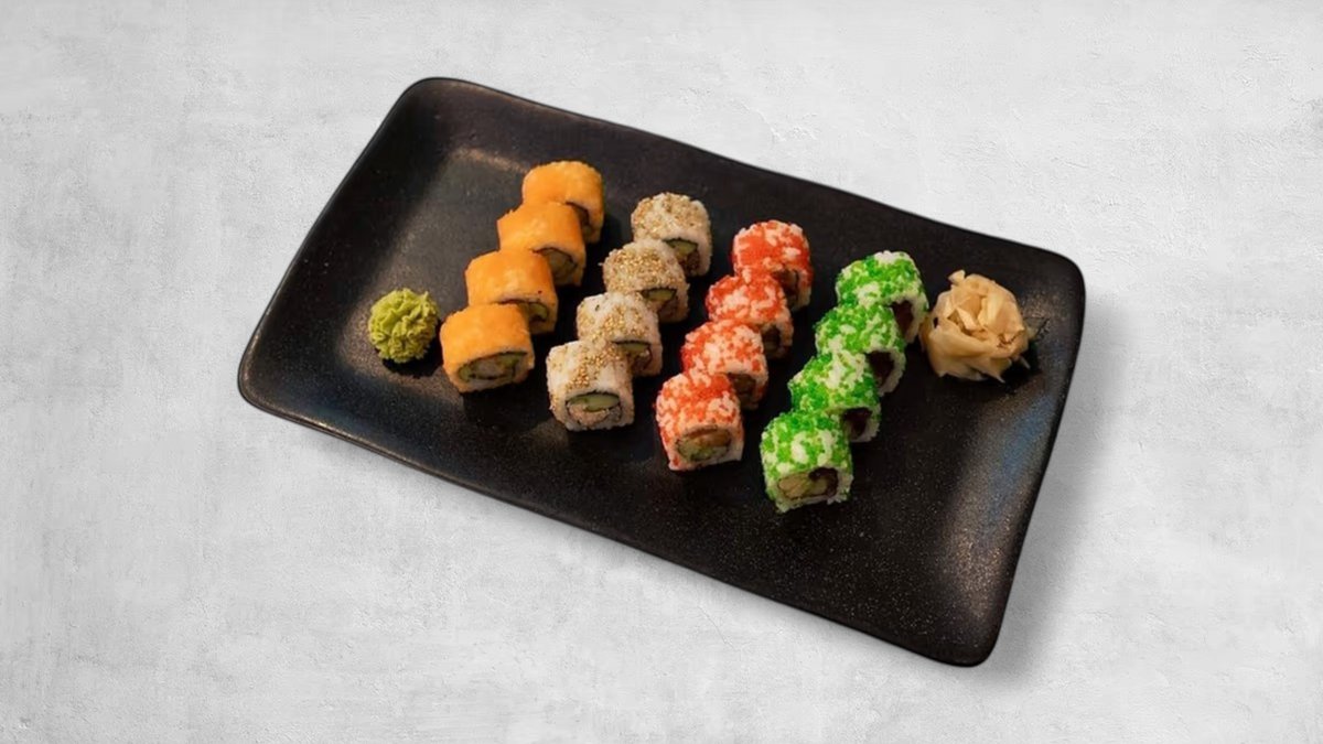VEGAN sushi mix menu consisting of 22 pieces: (4) Hosomaki AVOCADO, (4) Hosomaki CUCUMBER, (6) Futomaki VEGAN, (8) BONSAI Uramaki. Served together with pickled ginger & wasabi on the side. Check individual items for pictures.
