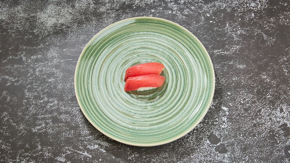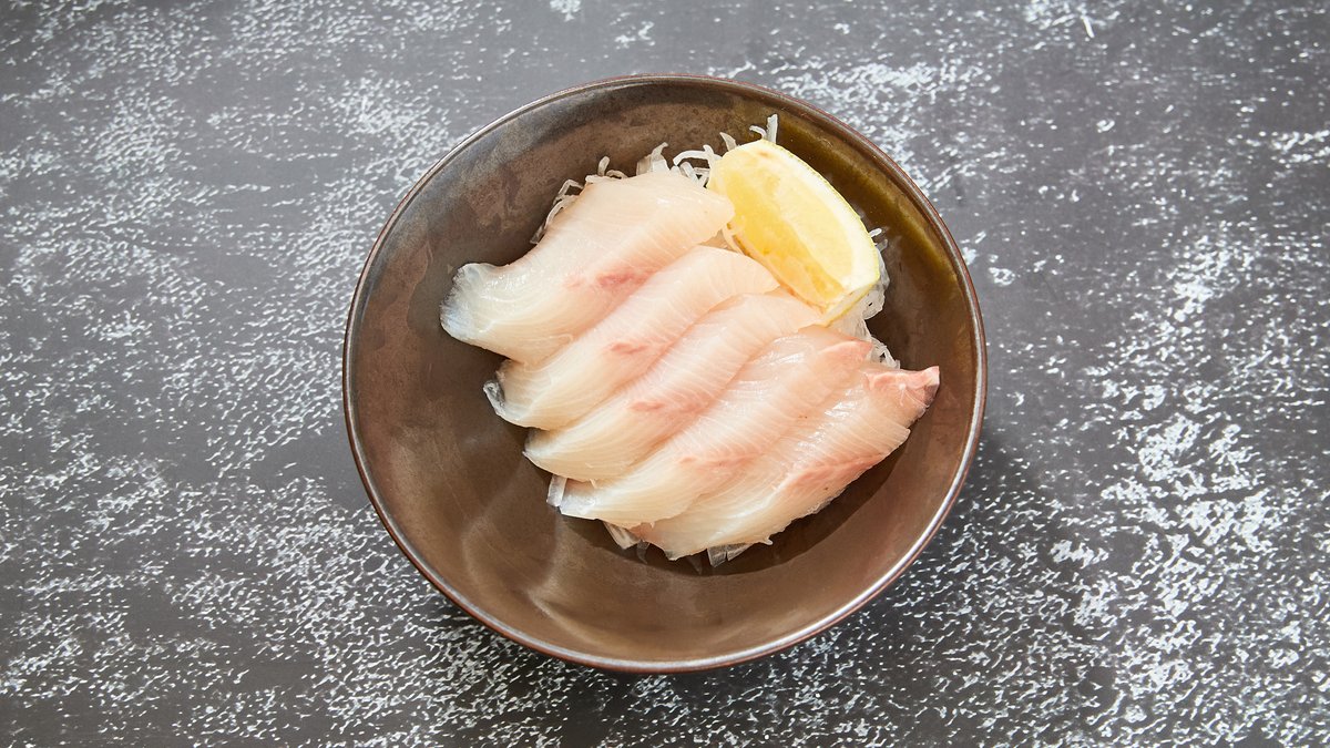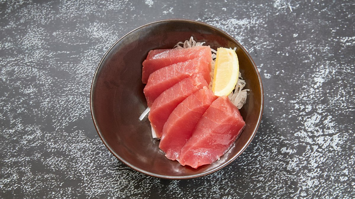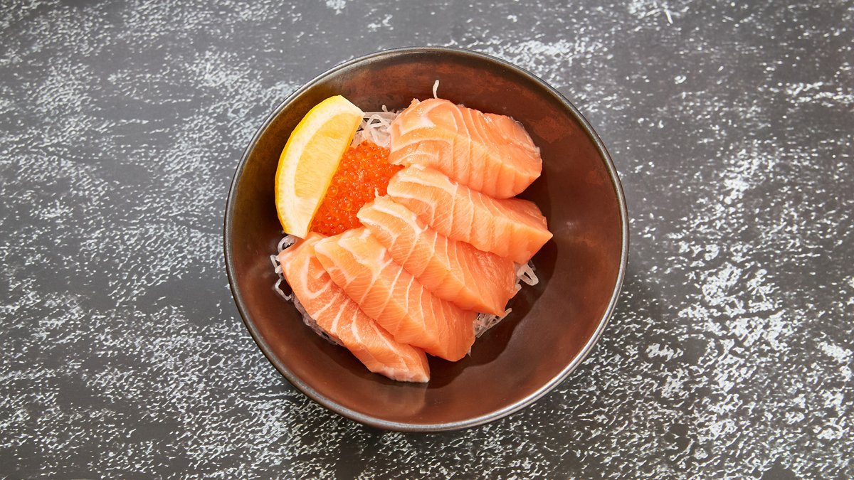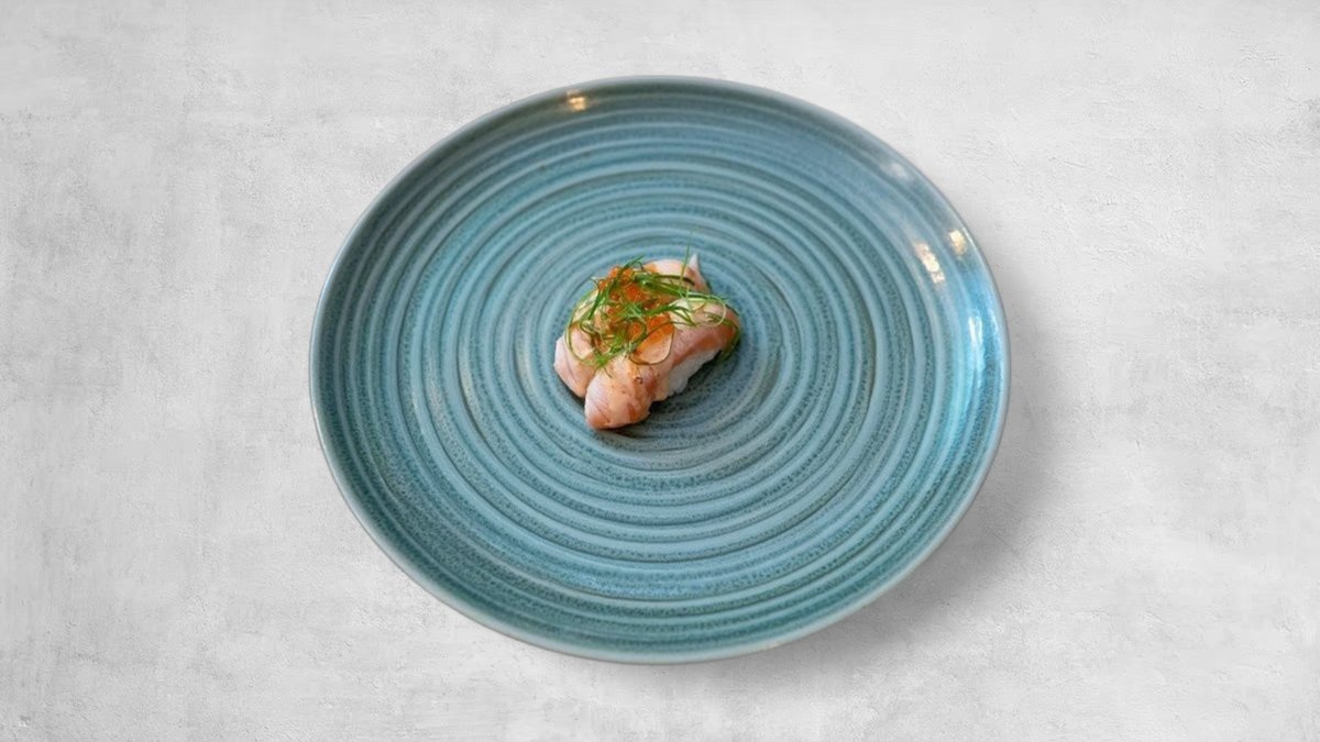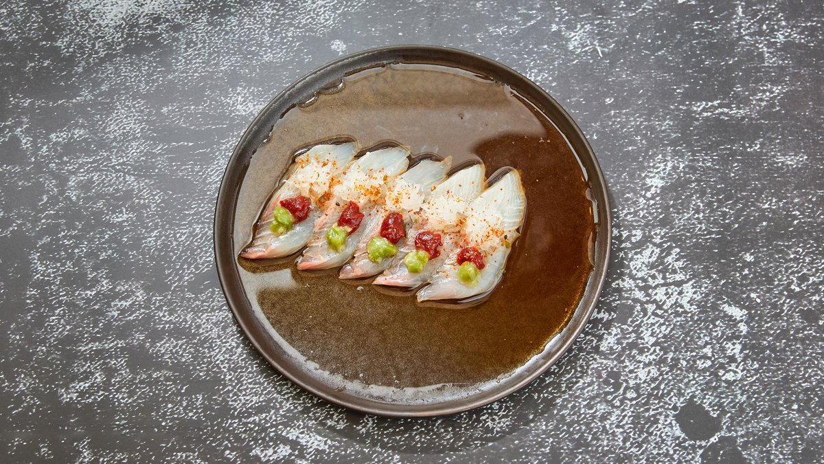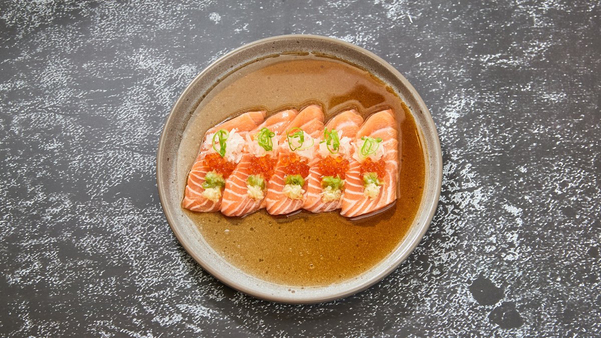 Serveret med ponzu, hvidløg, ingefær og ikura (lakseæg).