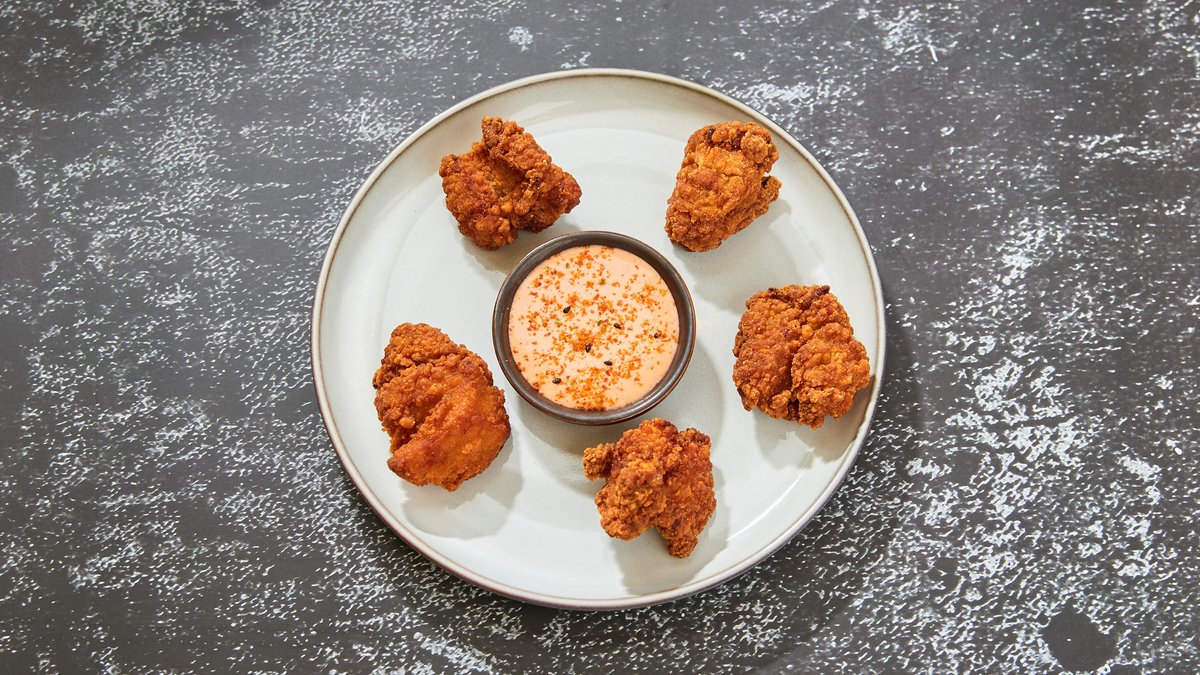Japansk friturestegt kylling serveret med en sød chilisauce.