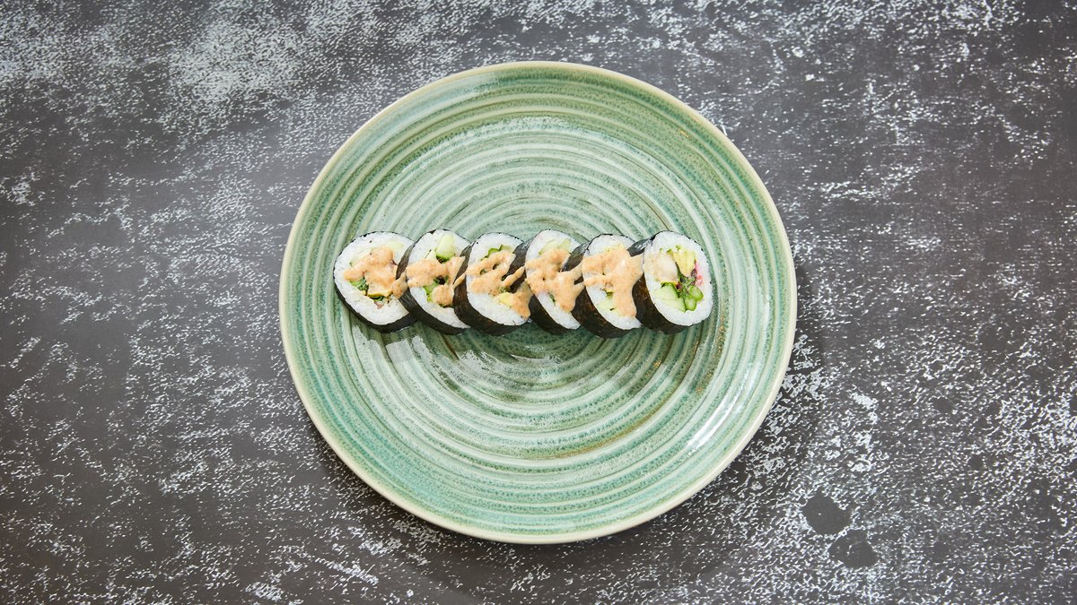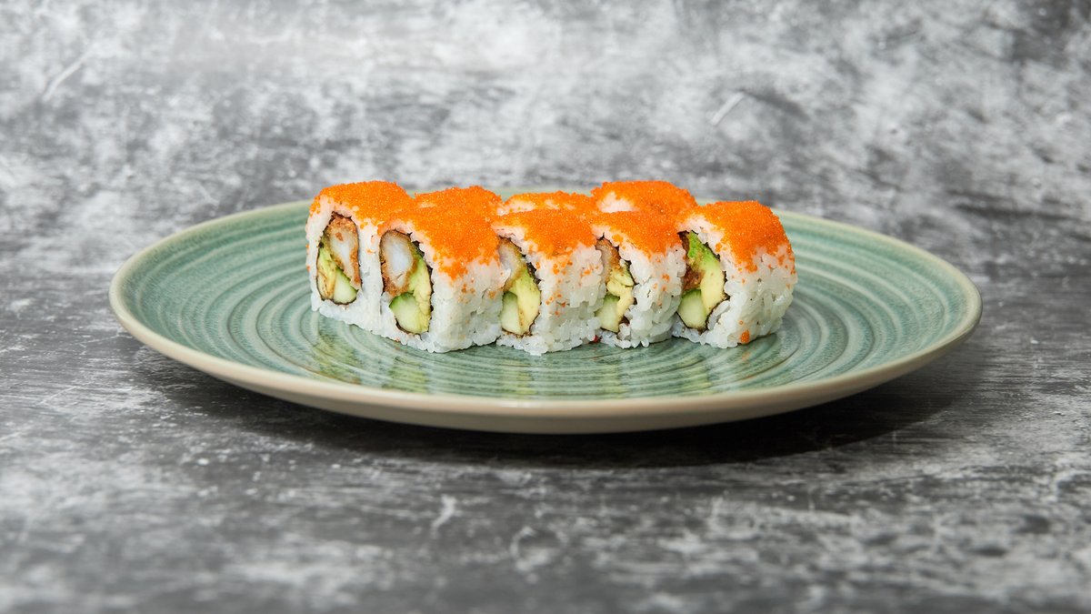 Tempurarejer, agurk, avocado, spicy mayo, og orange massago.