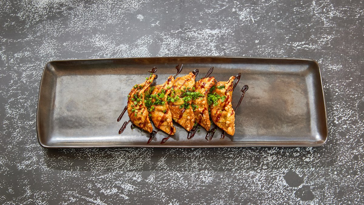 Gyoza med kylling, spicy mayo, teriyaki og purløg.