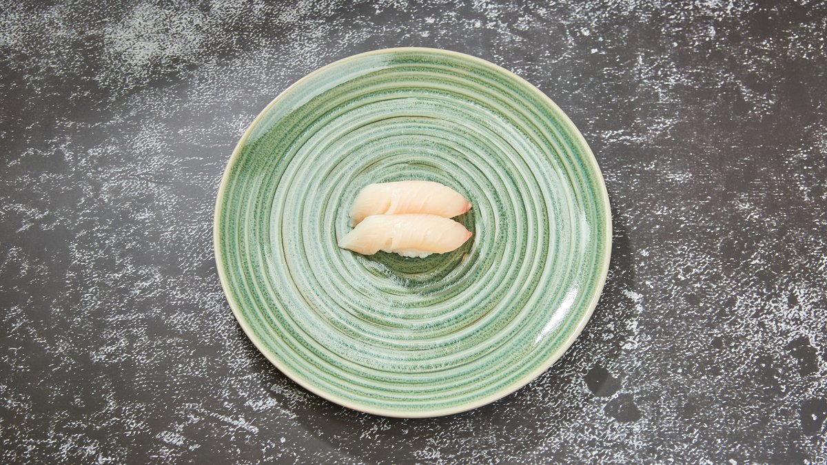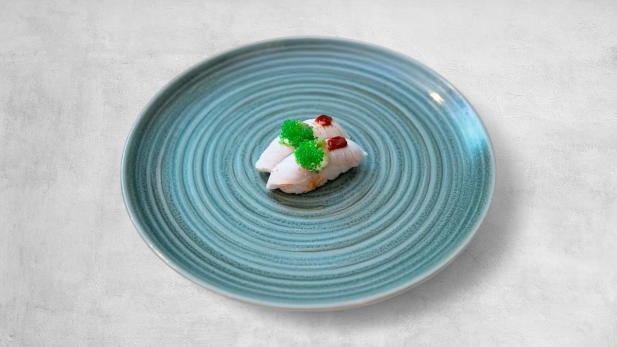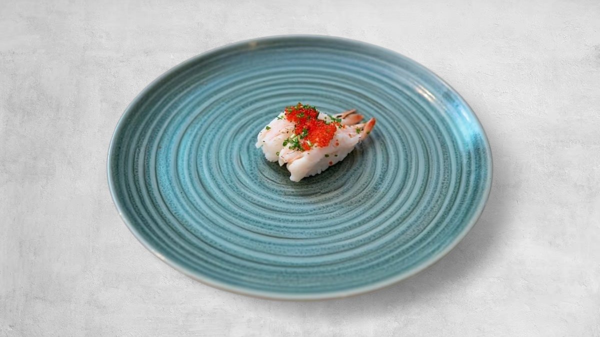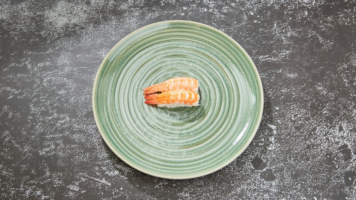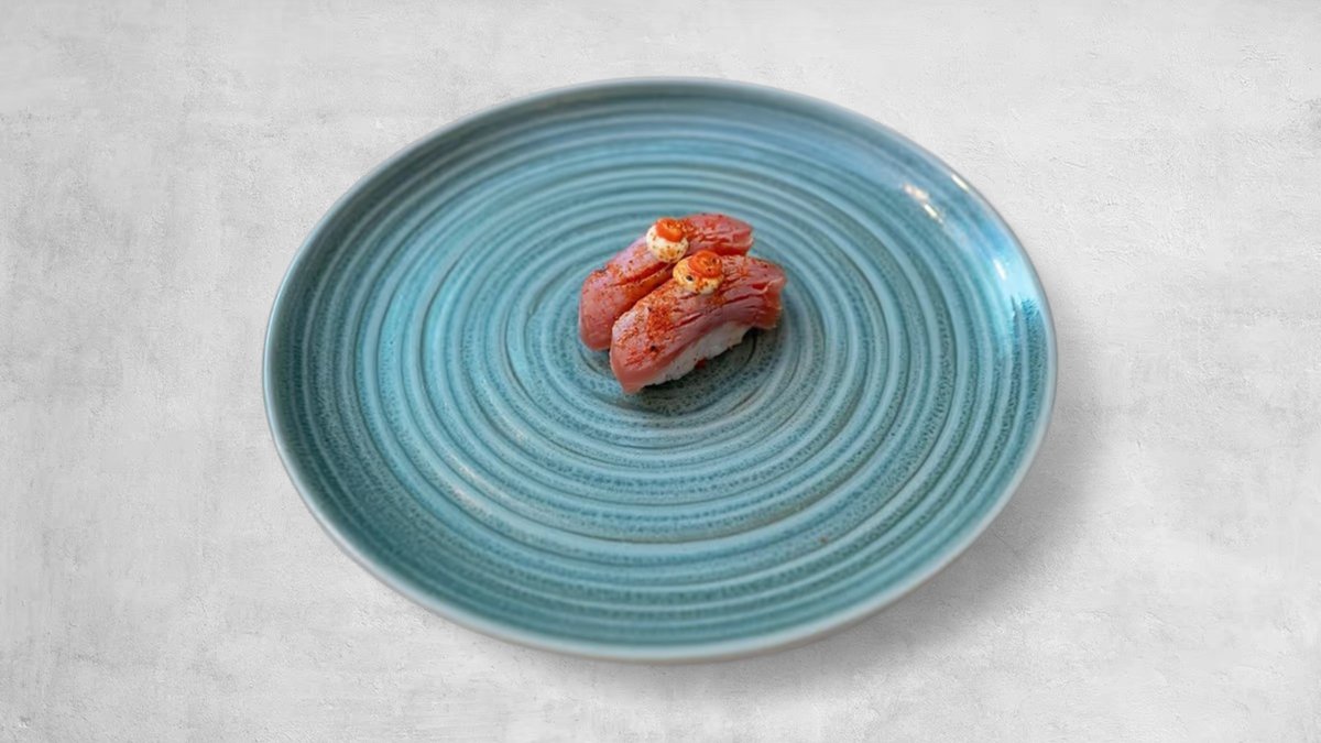Sizzling SHRIMP nigiri with shrimp on top our rich seasoned sushi rice, topped with wasabi mayo, red tobiko, and chives.