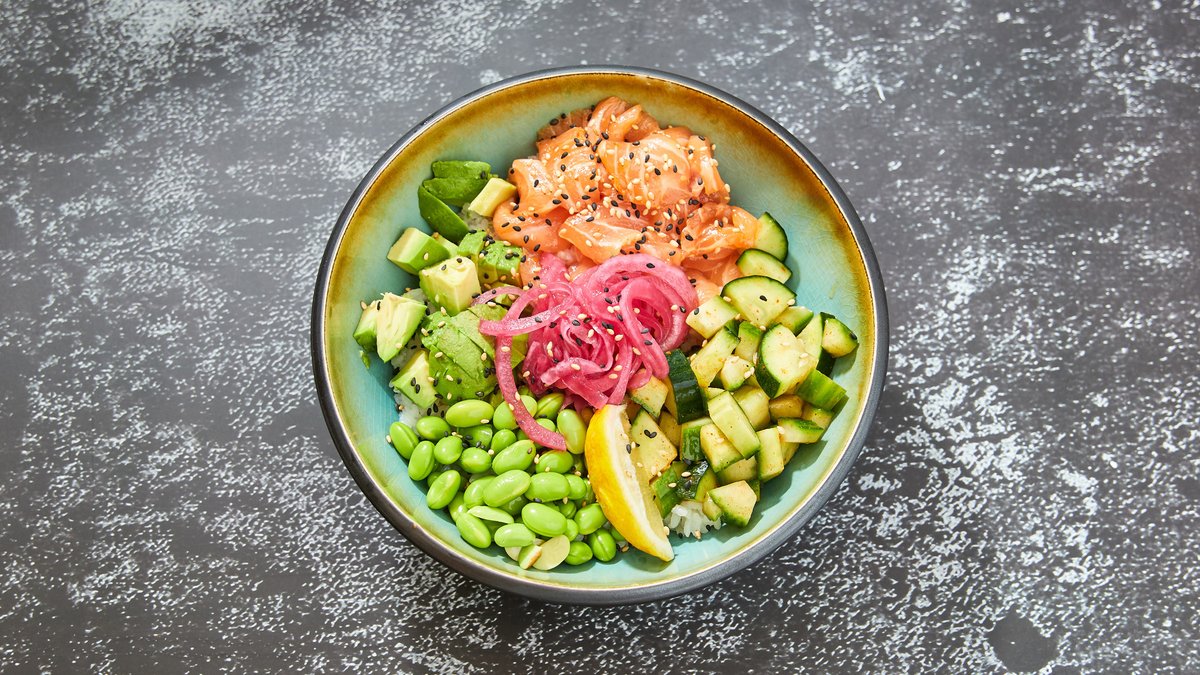 Ris, laks, avocado, edamamebønner, agurk, syltet rødløg og spicy mayo.
