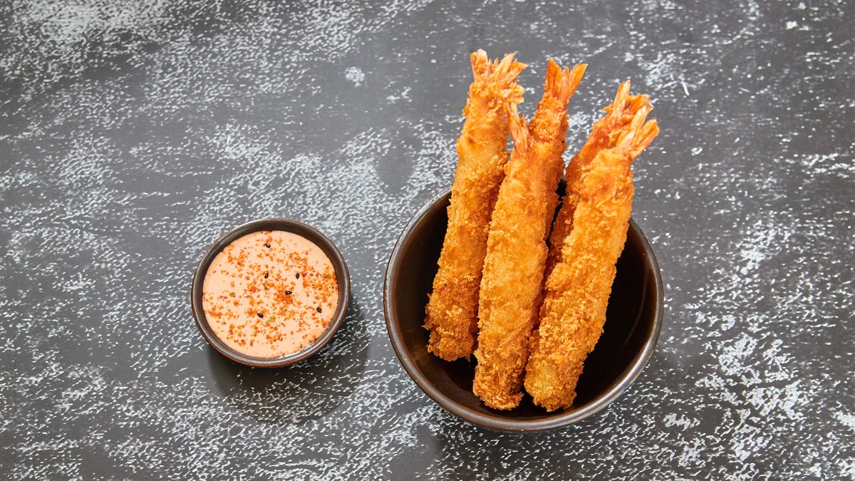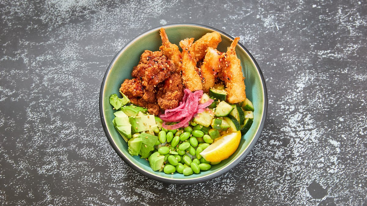 Tempurarejer, kylling, ris, edamamebønner, agurk, avocado, tobiko og wasabi-sesam.