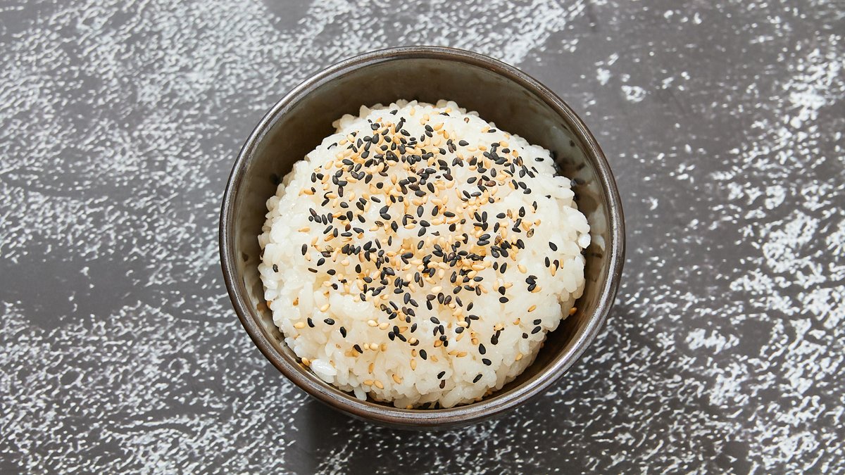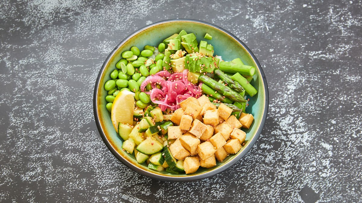 Ris, tofu, avocado, agurk, edamamebønner, asparges, syltet rødløg, purløg og kimchi-sesam.