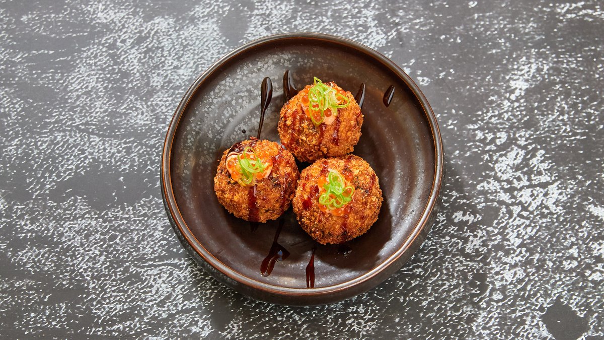 Lakekroketter toppet med spicy mayo, ikura og forårsløg.