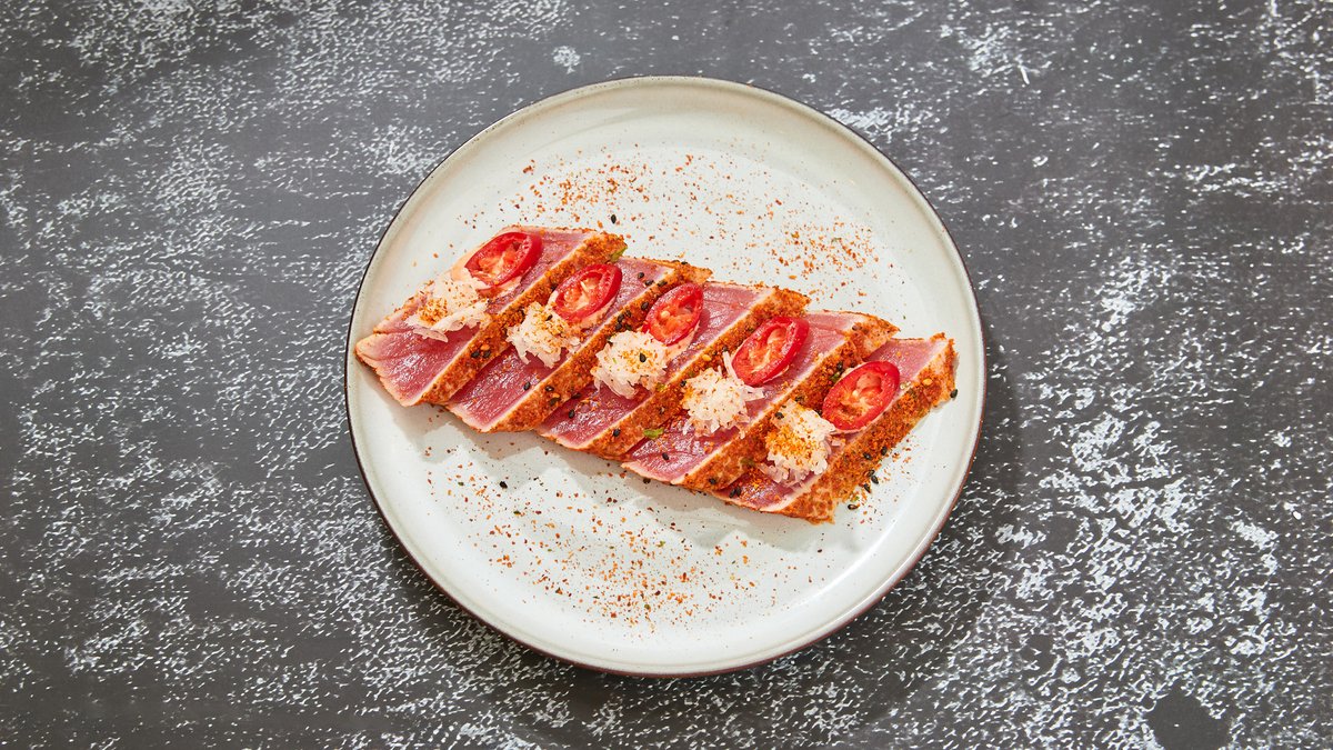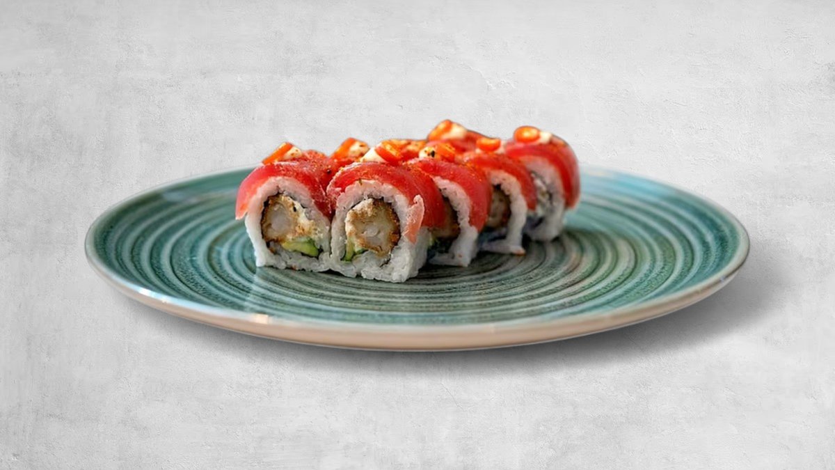 Tempura HAPS, cream cheese, avocado, garlic, topped with 🔥 TUNA TATAKI, and spicy mayo