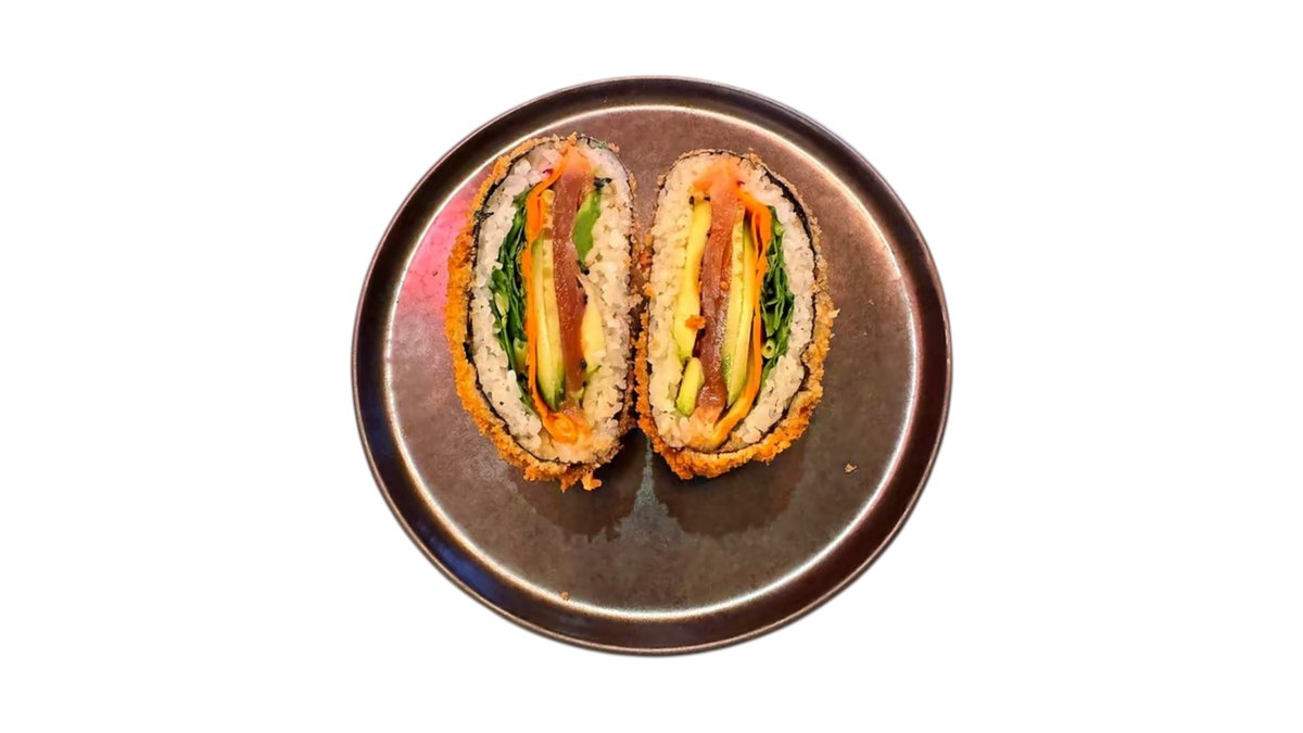 Vegetarian sushi burger with inari, avocado, carrot, cucumber, pickled red onion, mix salad, black & white sesame, with goma sesame dressing