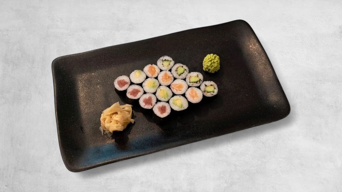 Hosomaki mix consisting of (4) Hosomaki Avocado, (4) Hosomaki Cucumber, (4) Hosomaki Salmon, and (4) Hosomaki Tuna, served together with pickled ginger & wasabi on the side. Check individual hosomaki for pictures.