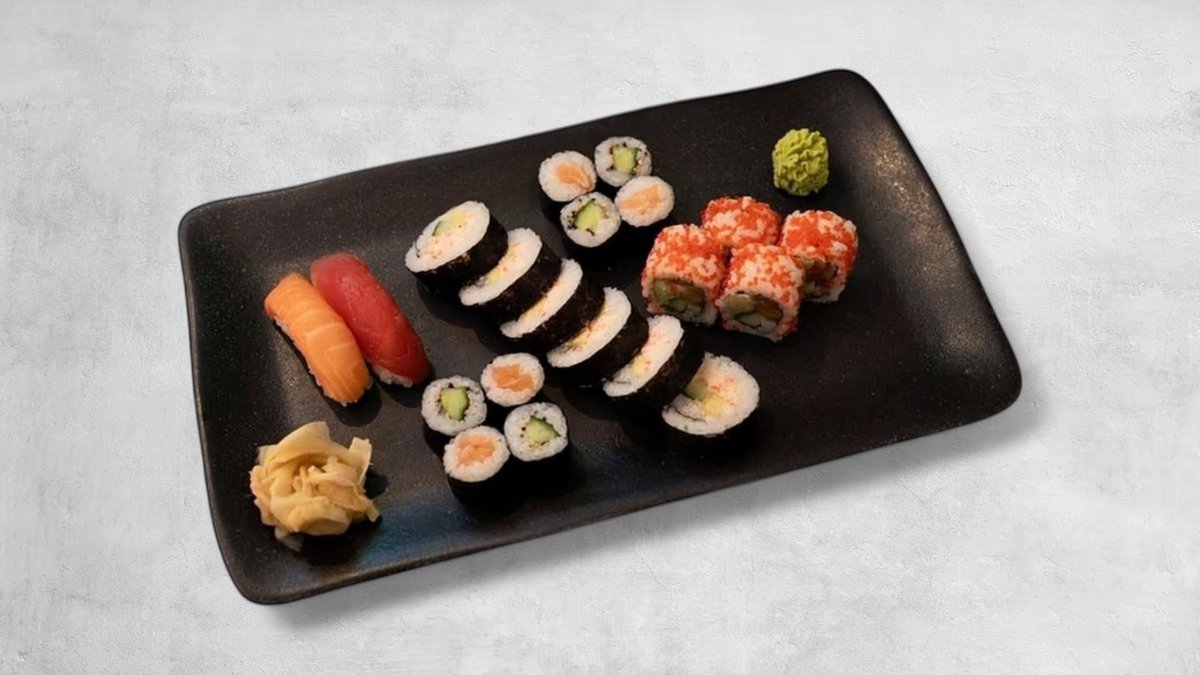 A mix of in total 20 sushi pieces: (4) Cucumber Hosomaki, (4 ) Salmon Hosomaki, (6) California Futomaki, (4) Alaska Uramaki, (1) Salmon Nigiri, (1) Tuna Nigiri, served together with pickled ginger & wasabi on the side. Check individual items for pictures.