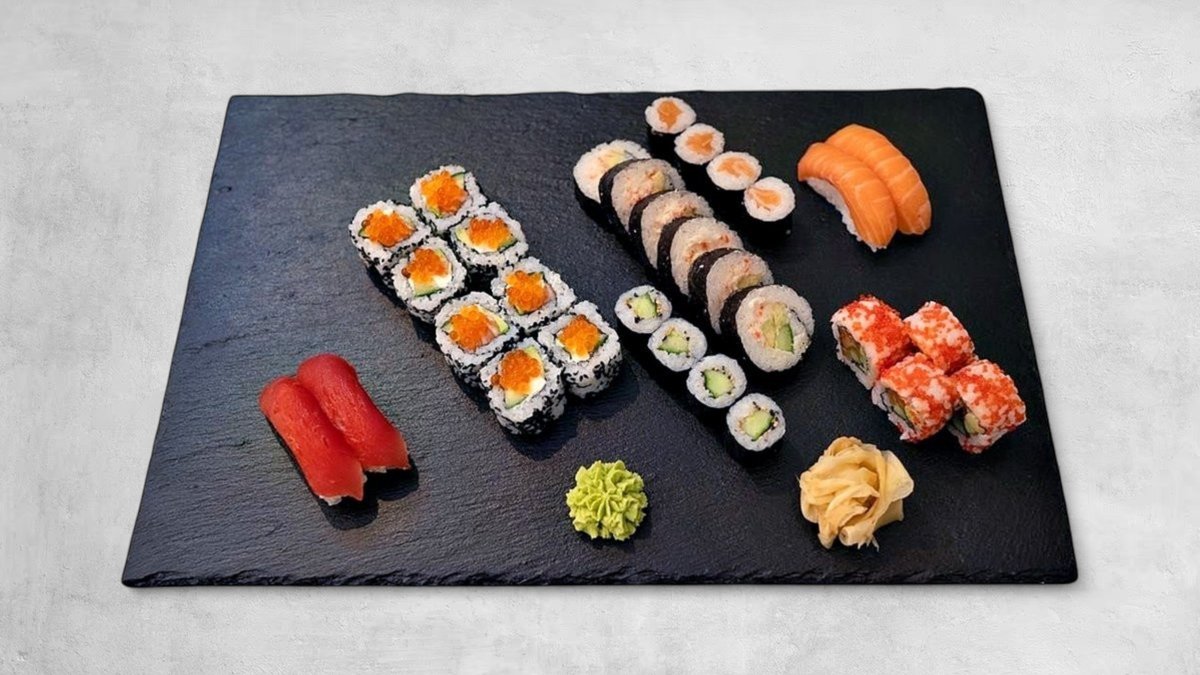 The perfect date menu with 30 sushi pieces consisting of: (4) CUCUMBER Hosomaki, (4 ) SALMON Hosomaki, (6) CALIFORNIA Futomaki, (4) ALASKA Uramaki, (8) PHILADELPHIA Uramaki, (2) SALMON Nigiri, (2) TUNA Nigiri. Served together with pickled ginger & wasabi on the side. Check individual items for pictures.