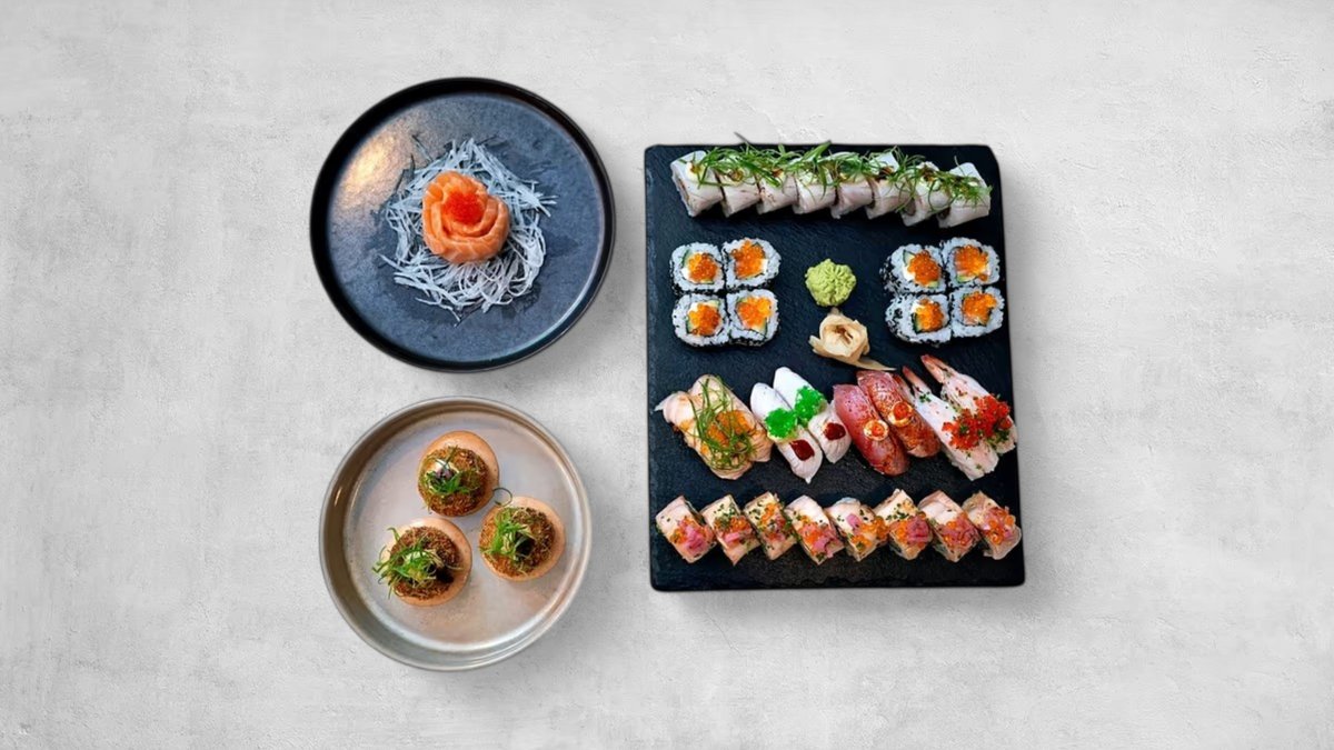 Premium NYE 2025 menu for 2 people consisting of 40 carefully selected sushi pieces: (5) Ceviche Salmon starter, (3) Salmon Croquettes starter, (2) Sizzling SHRIMP Nigiri, (2) Sizzling SALMON Nigiri, (2) Sizzling WHITE FISH Nigiri, (2) Sizzling TUNA TATAKI Nigiri, (8) PHILADELPHIA Uramaki, (8) WHITE TIGER Kaburamaki, (8) FUJI Kaburamaki, served with pickled ginger and wasabi. Check individual items for pictures and description.