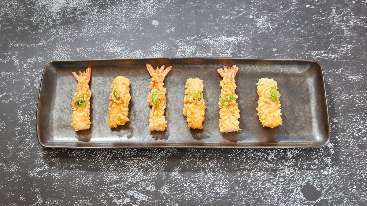Tempurarejer, kylling, ris, edamamebønner, agurk, avocado, tobiko og wasabi-sesam.