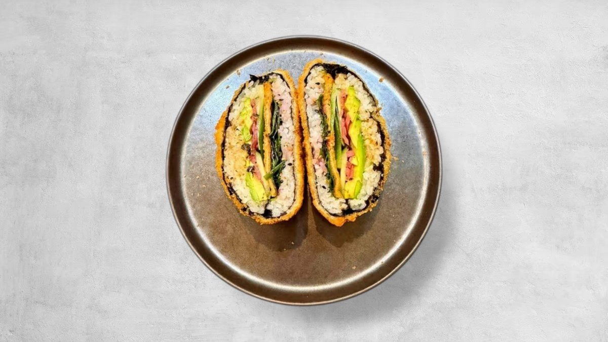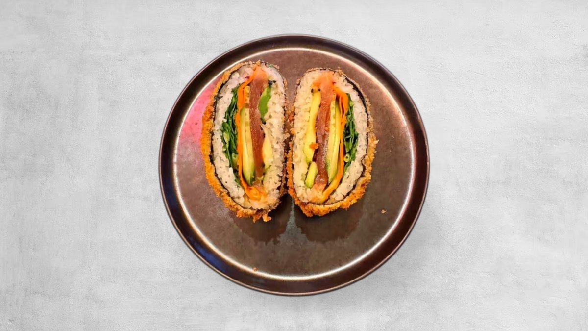 Vegetarian sushi burger with inari, avocado, carrot, cucumber, pickled red onion, mix salad, black & white sesame, with goma sesame dressing