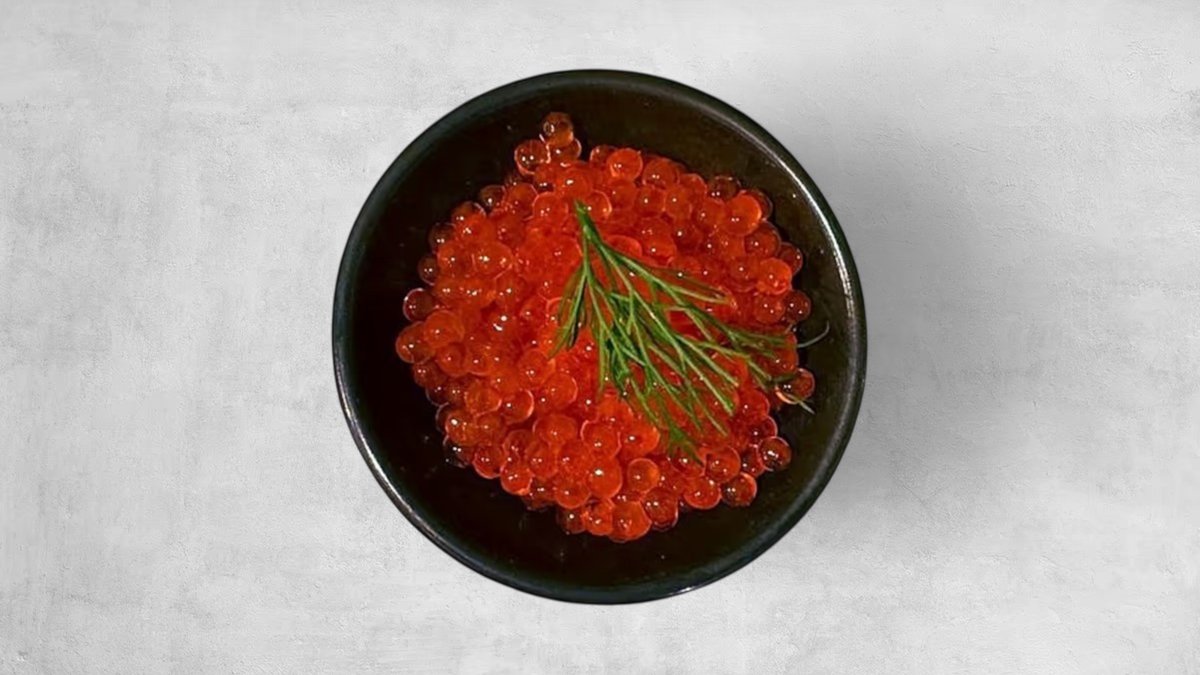 Serveret med ponzu, hvidløg, ingefær og ikura (lakseæg).
