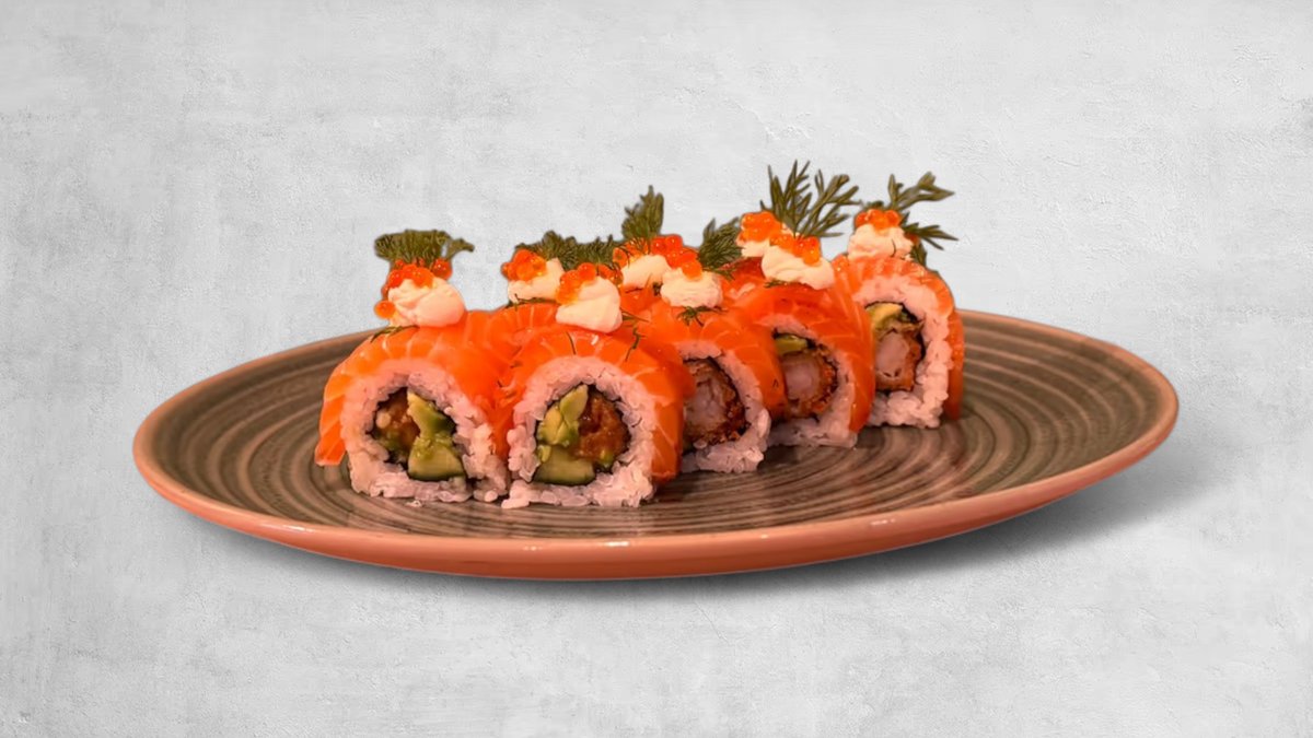 Tempurarejer, hvidløg og avocado – toppet med 🔥 flamberet laks, syltet rødløg, spicy mayo, teriyaki og tobiko.