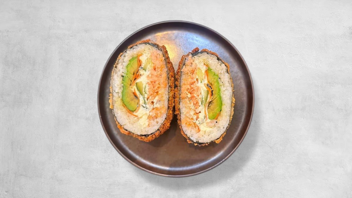 🔥 Grilled Salmon SUSHI BURGER with grilled snow flake salmon, creme cheese, avocado, carrot, cucumber, spicy mayo, black & white sesame