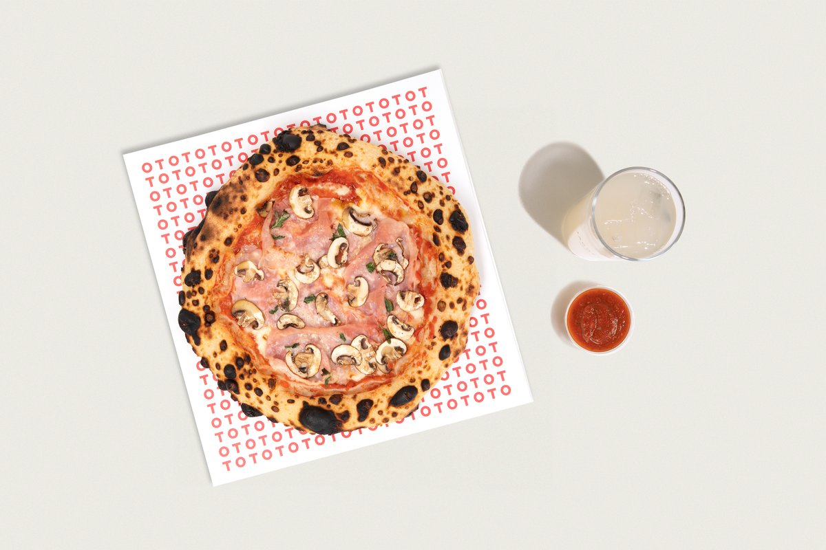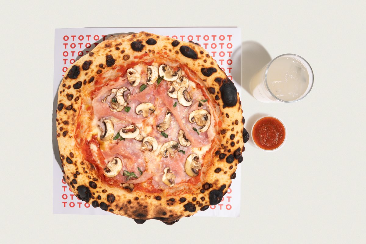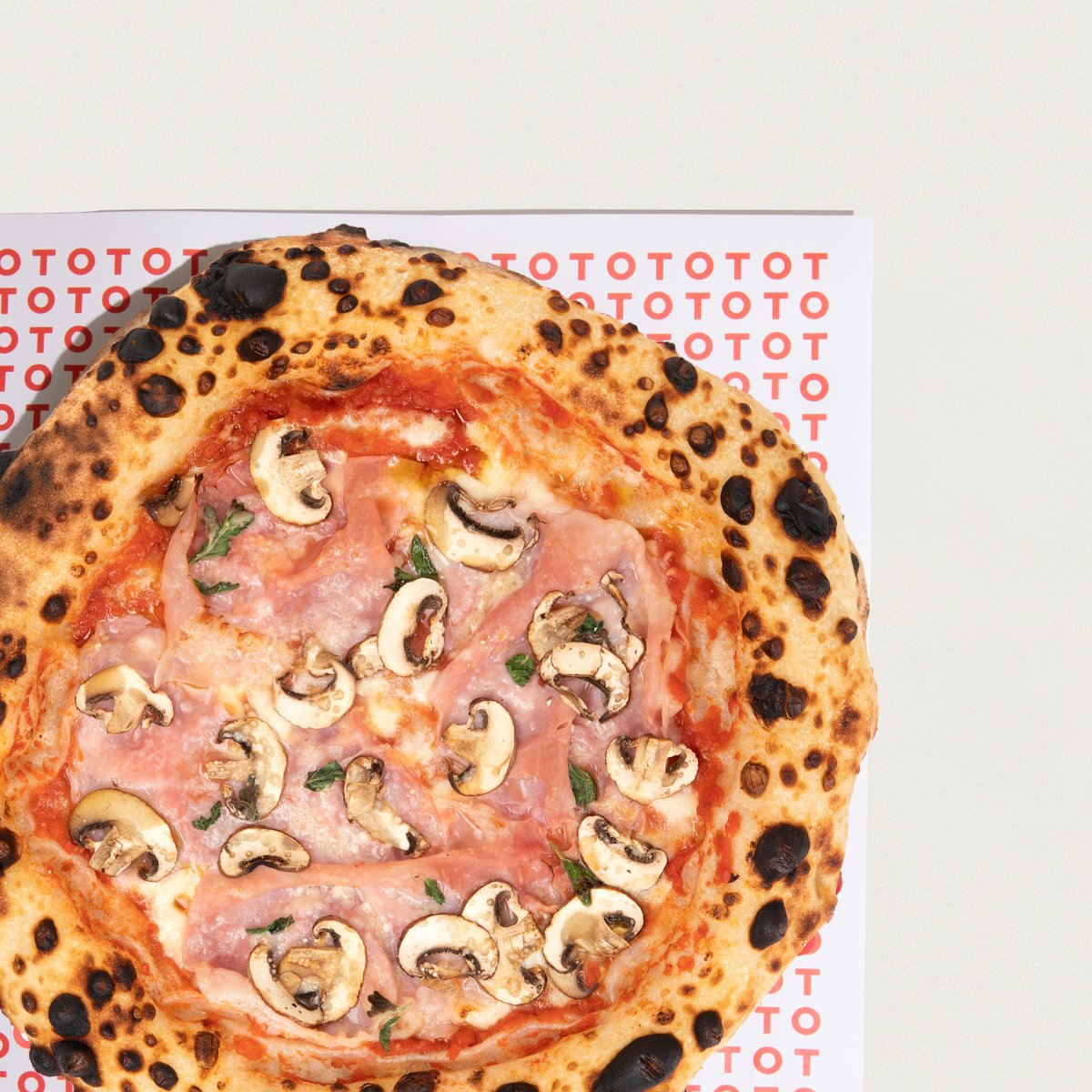Skinke, tomat, mozzarella, frisk oregano, champignon, parmesan. Bag din pizza færdig derhjemme. 3 minutter i en 250 grader varm ovn.