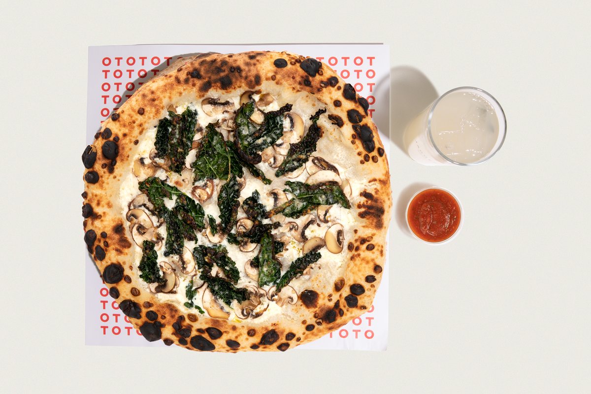 Mascarponecreme, mozzarella, champignon, palmekål, parmesan.