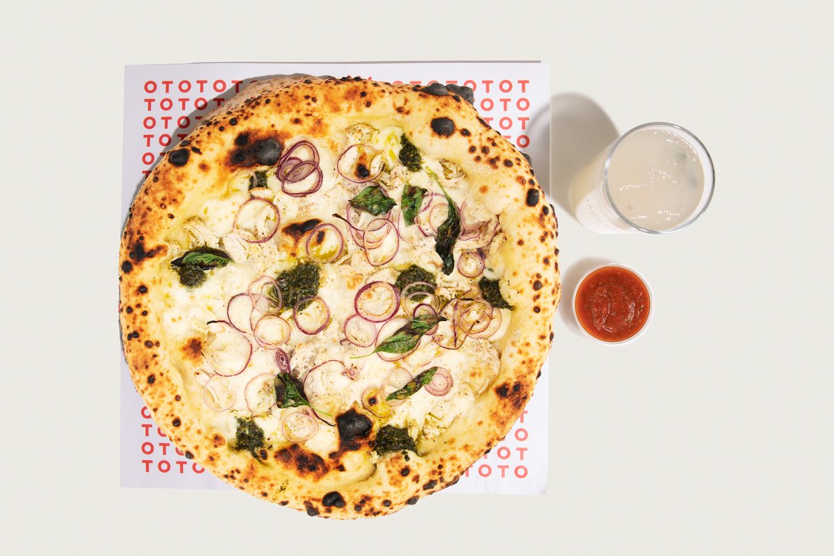 Lunch-size pizza med mozzarella, kylling, grøn pesto, rødløg, grønne oliven, basillikum, parmesan, sort peber. Inkl. valgfri drikkevare og Marinara dip.