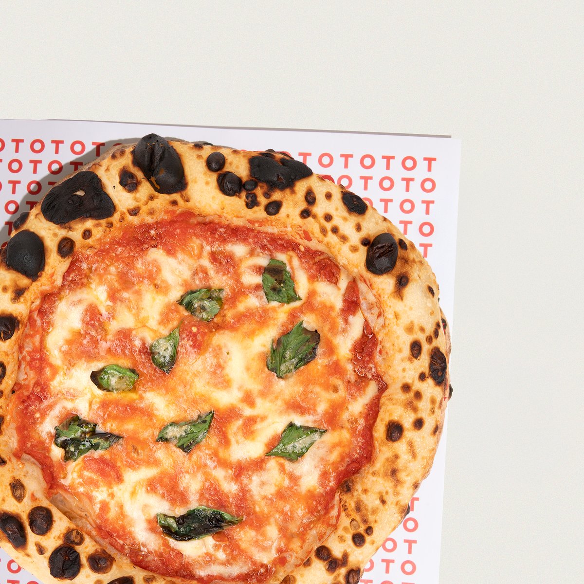 Tomat, mozzarella, basilikum, parmesan. Bag din pizza færdig derhjemme. 3 minutter i en 250 grader varm ovn.