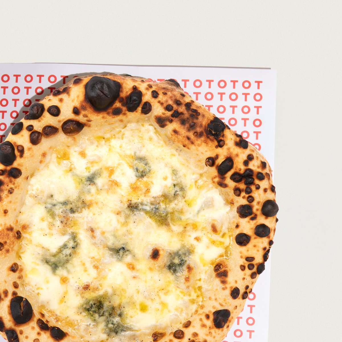 Kartoffel, mascarponecreme, mozzarella, rosmarin, parmesan, sort peber. Bag din pizza færdig derhjemme. 3 minutter i en 250 grader varm ovn.