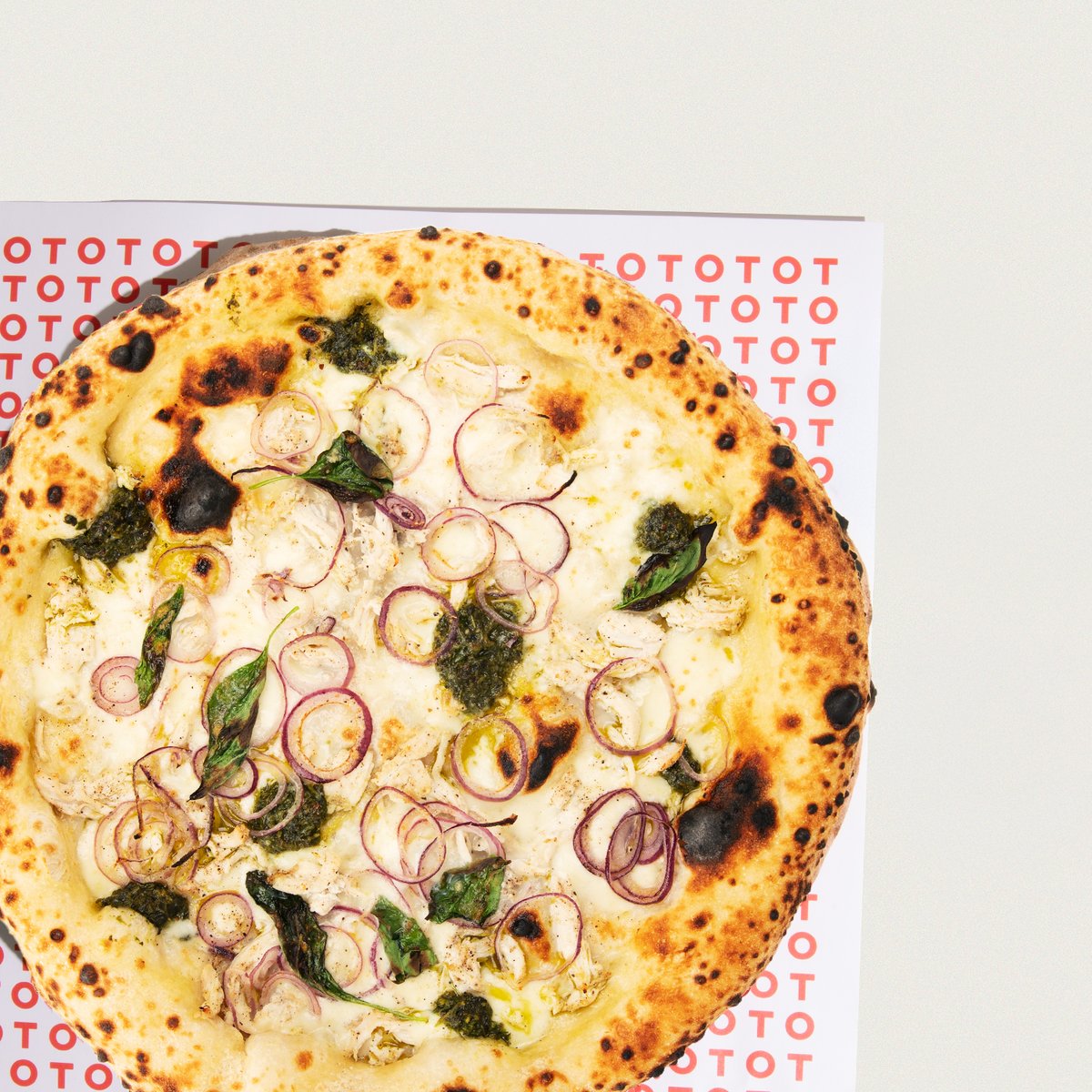 Mozzarella, kylling, grøn pesto, rødløg, grønne oliven, basillikum, parmesan, sort peber.